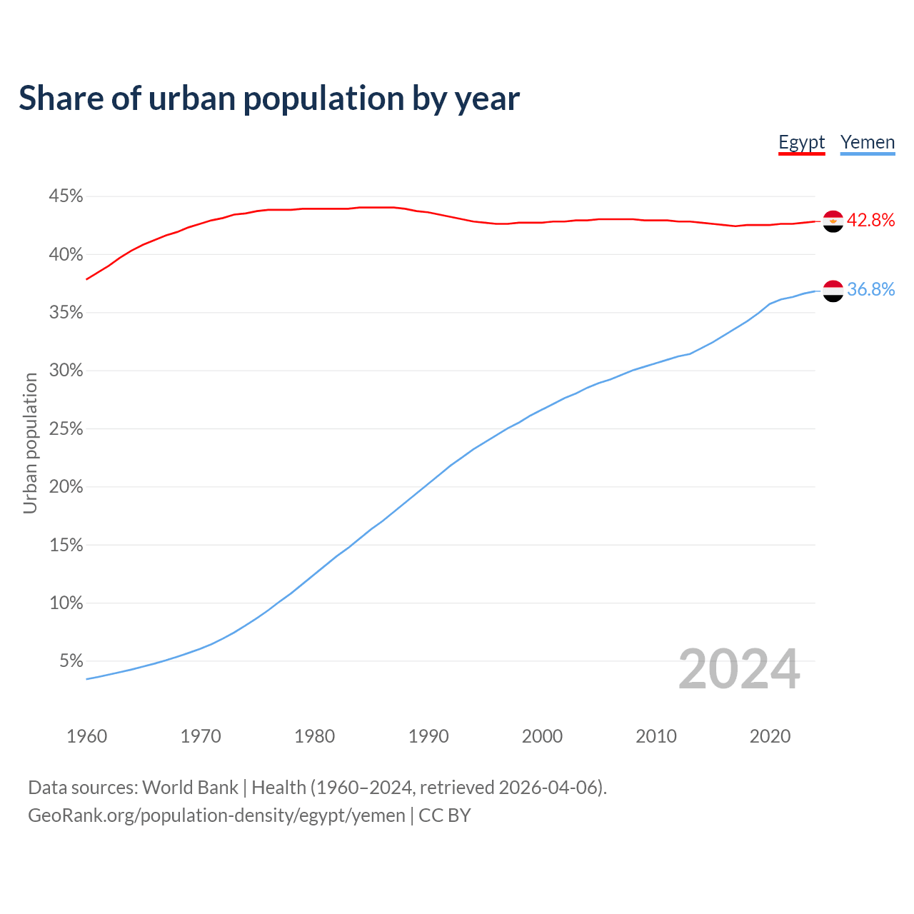 From 2004 to 2024, the share of urban population changed from 42.9% to 42.8% in Egypt and from 28.5% to 36.8% in Yemen.