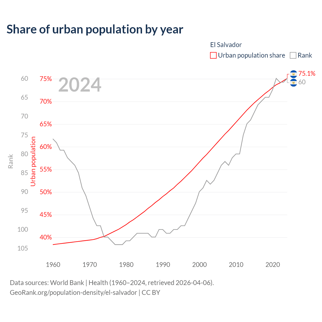 This chart shows the share of urban population in El Salvador from 1960 to 2024: 38.4% lived in urban areas in 1960, 56.6% in 2000, and 75.1% in 2024.