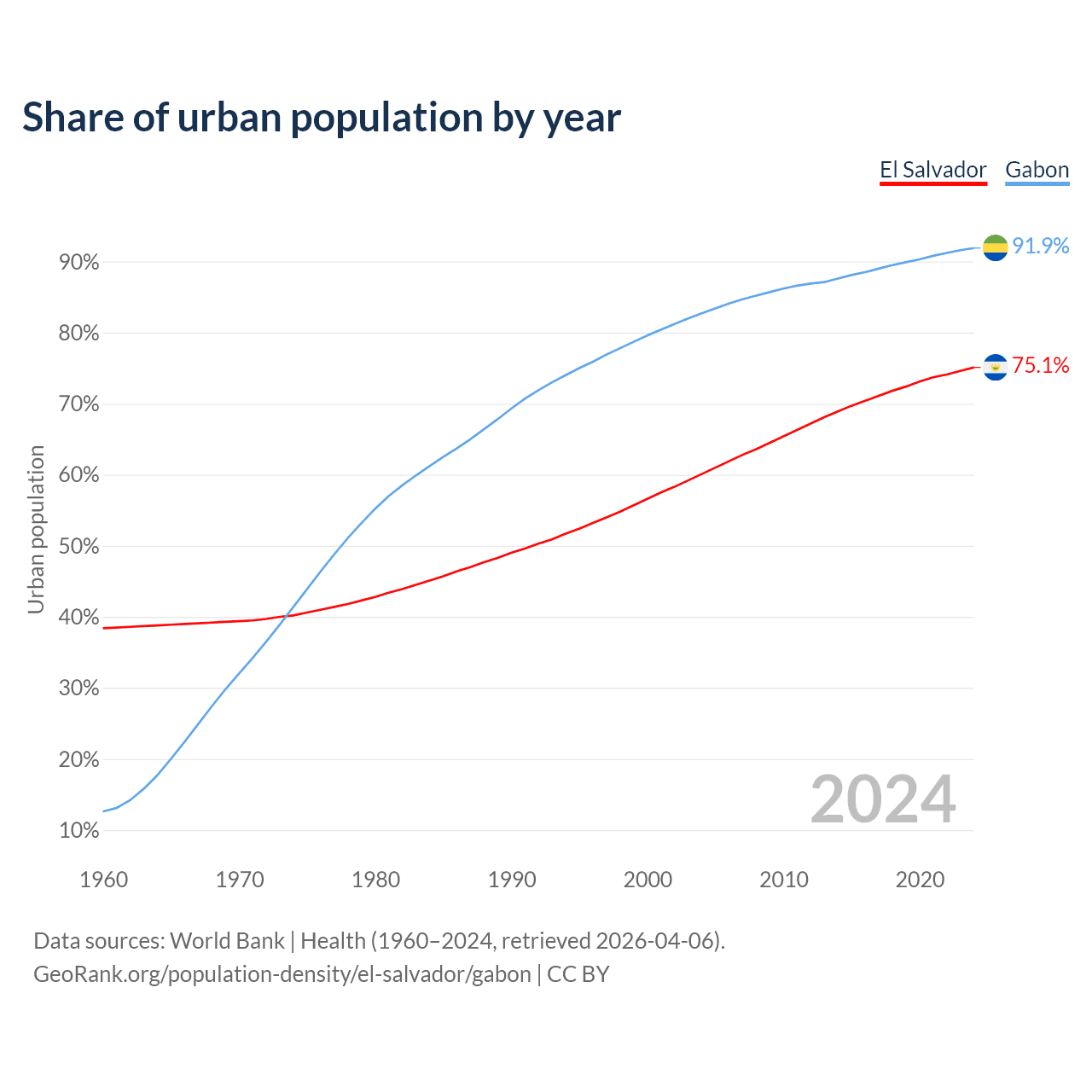 From 2004 to 2024, the share of urban population changed from 60.1% to 75.1% in El Salvador and from 82.7% to 91.9% in Gabon.