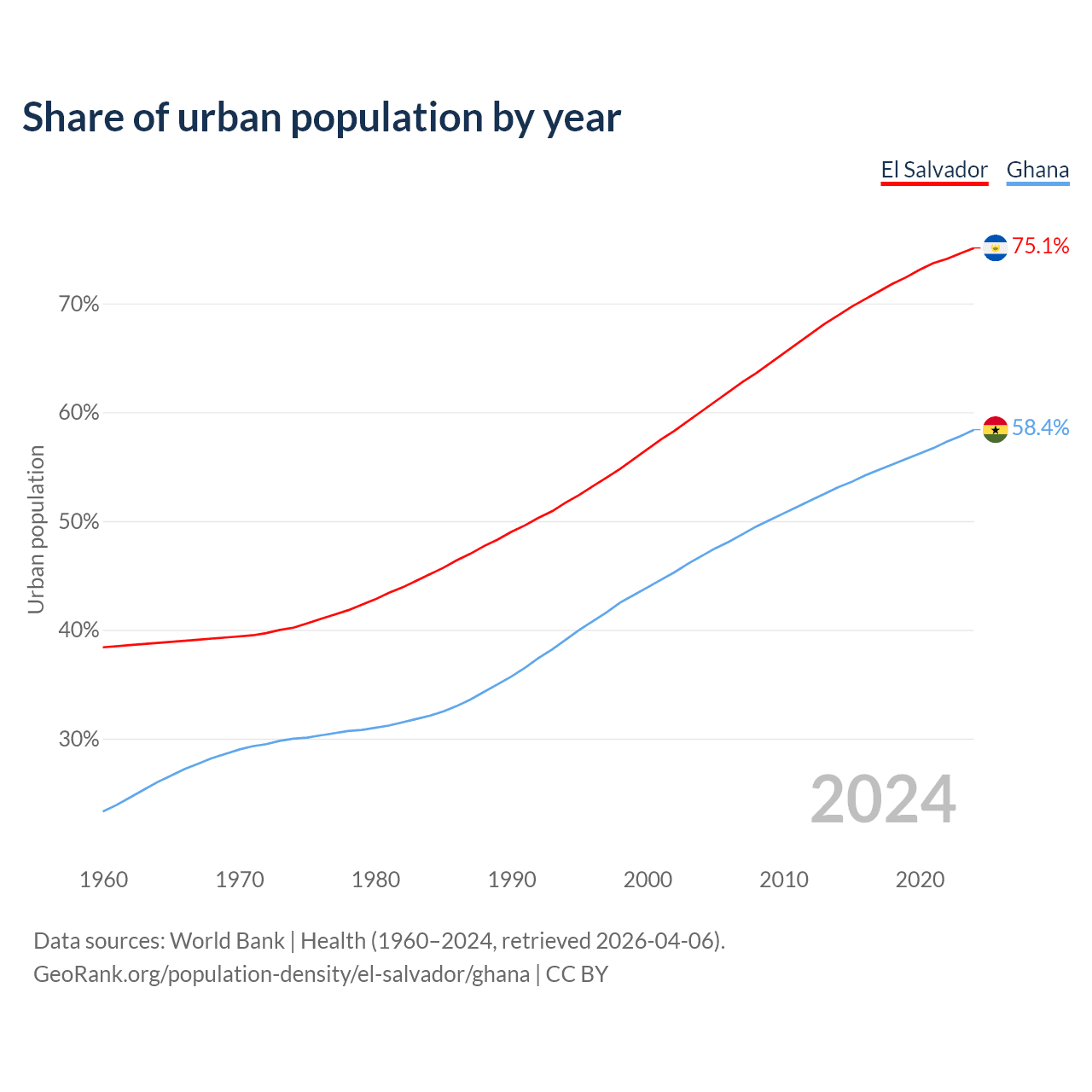From 2004 to 2024, the share of urban population changed from 60.1% to 75.1% in El Salvador and from 46.8% to 58.4% in Ghana.