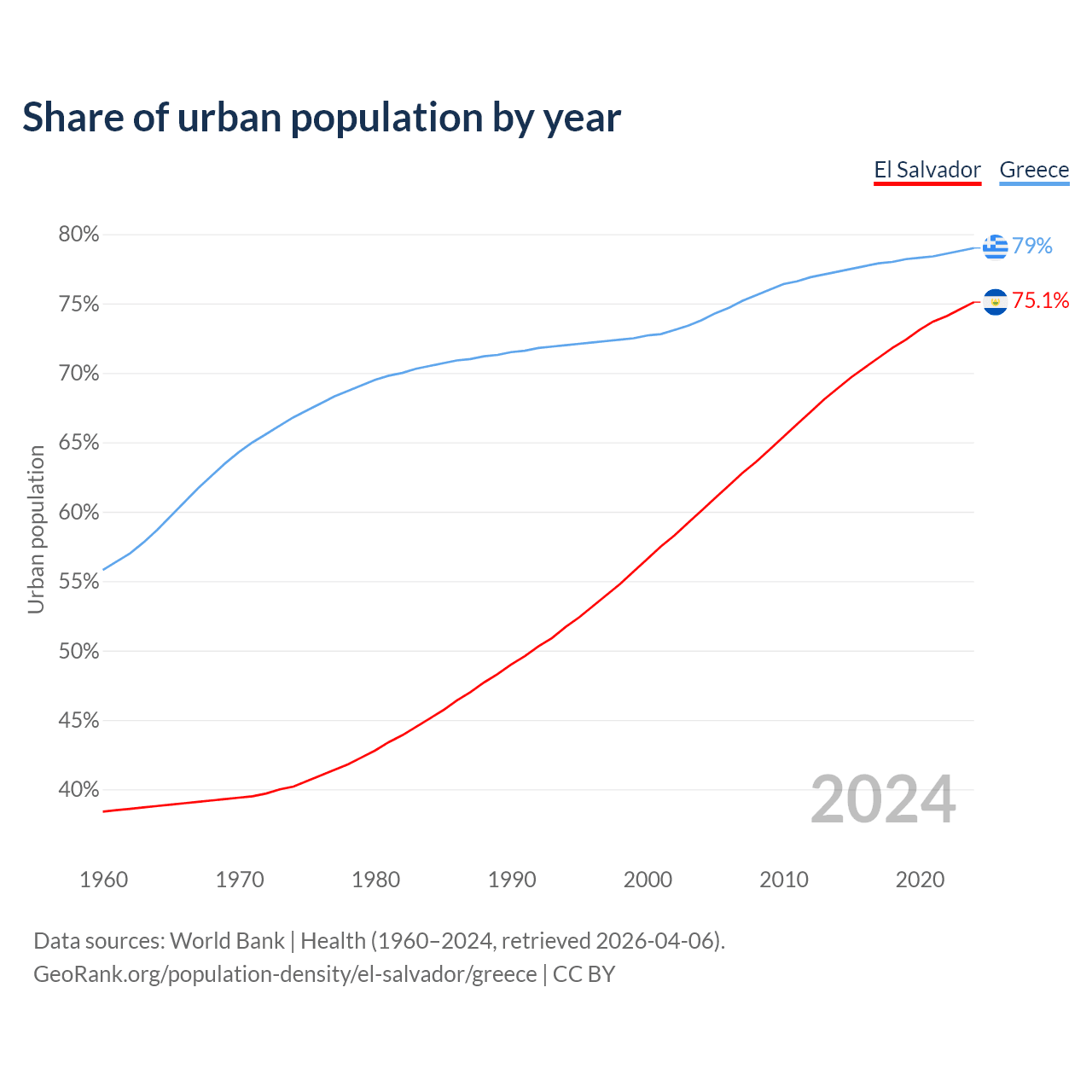 From 2004 to 2024, the share of urban population changed from 60.1% to 75.1% in El Salvador and from 73.8% to 79% in Greece.