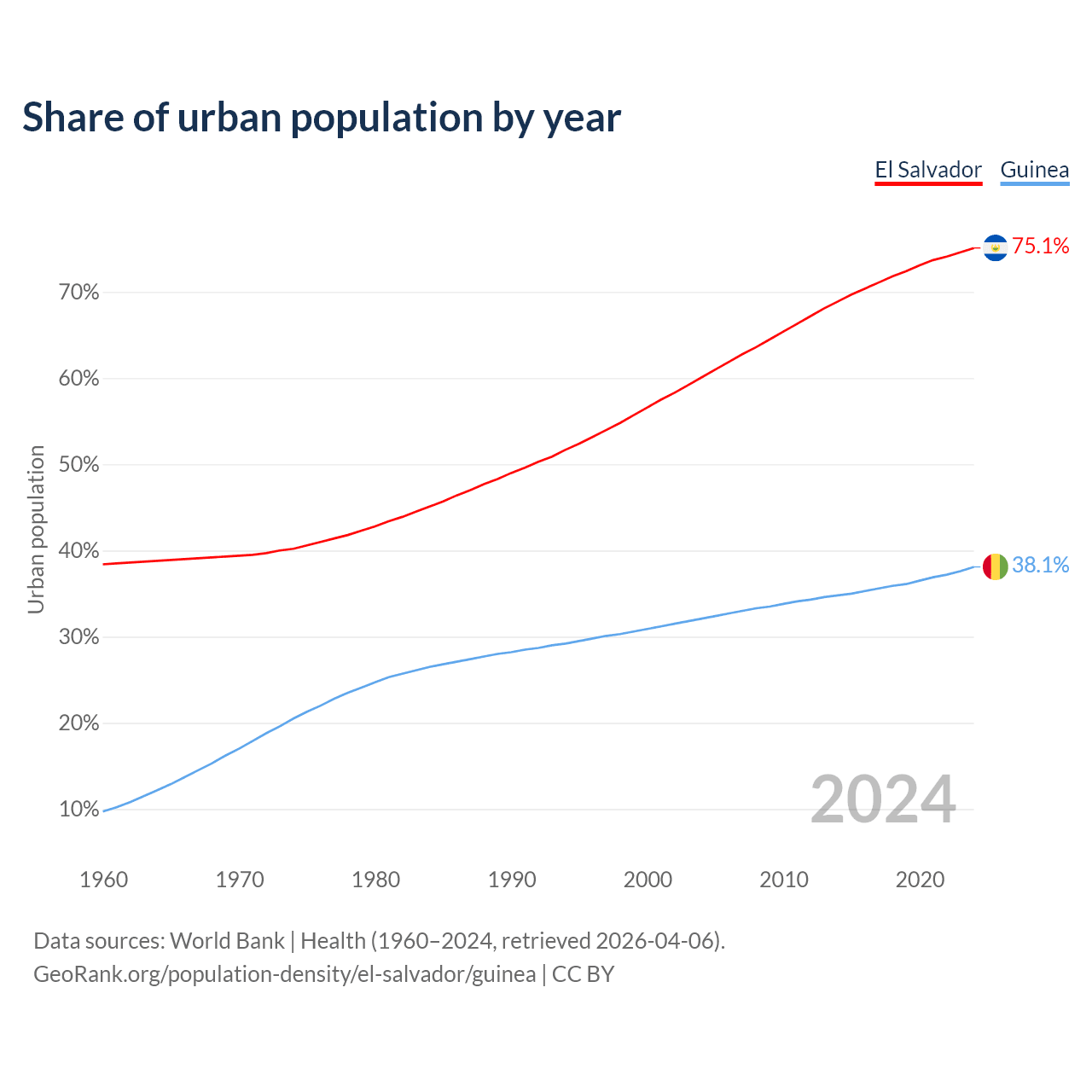 From 2004 to 2024, the share of urban population changed from 60.1% to 75.1% in El Salvador and from 32.1% to 38.1% in Guinea.