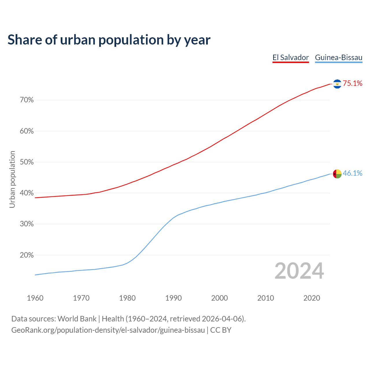 From 2004 to 2024, the share of urban population changed from 60.1% to 75.1% in El Salvador and from 38.1% to 46.1% in Guinea-Bissau.