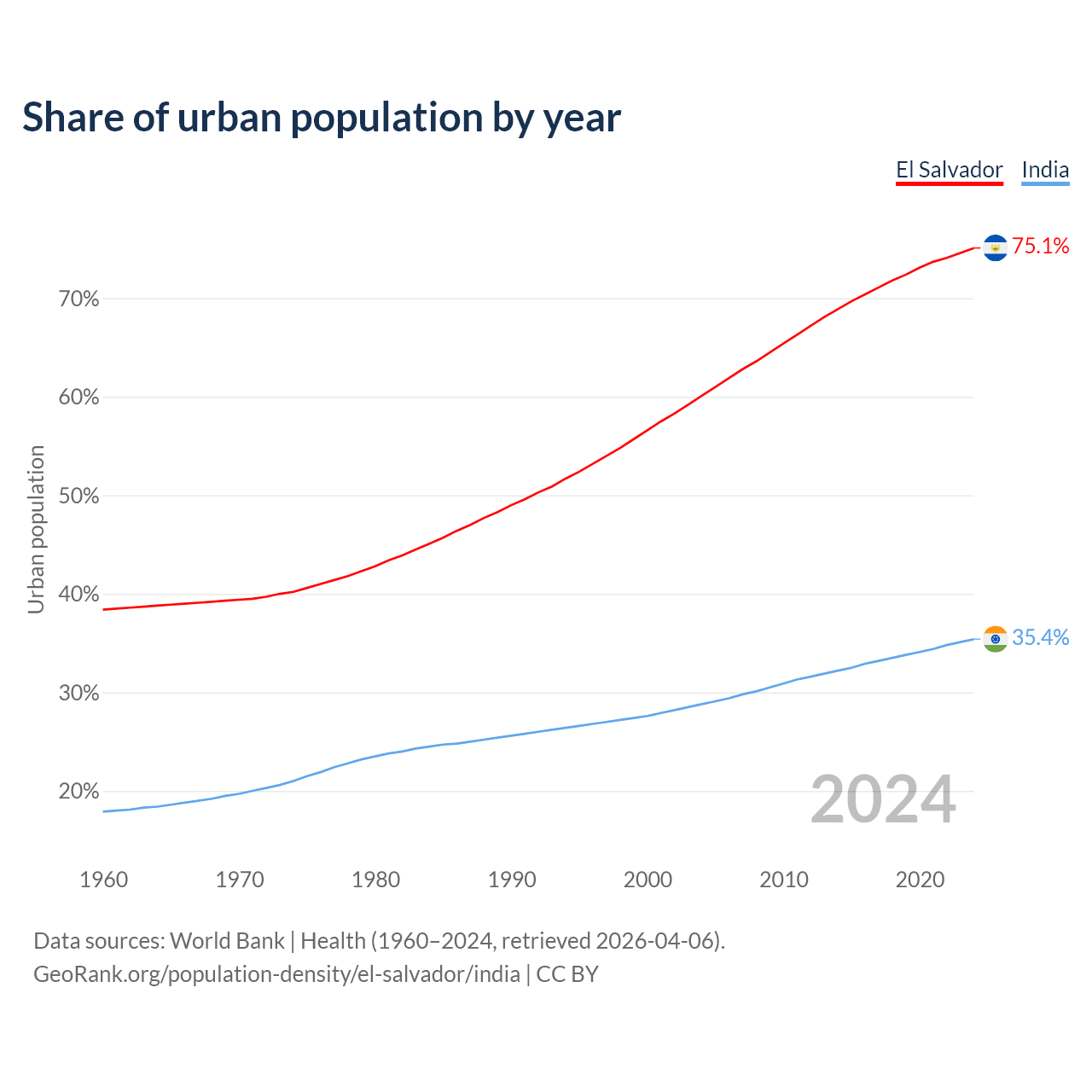 From 2004 to 2024, the share of urban population changed from 60.1% to 75.1% in El Salvador and from 28.8% to 35.4% in India.