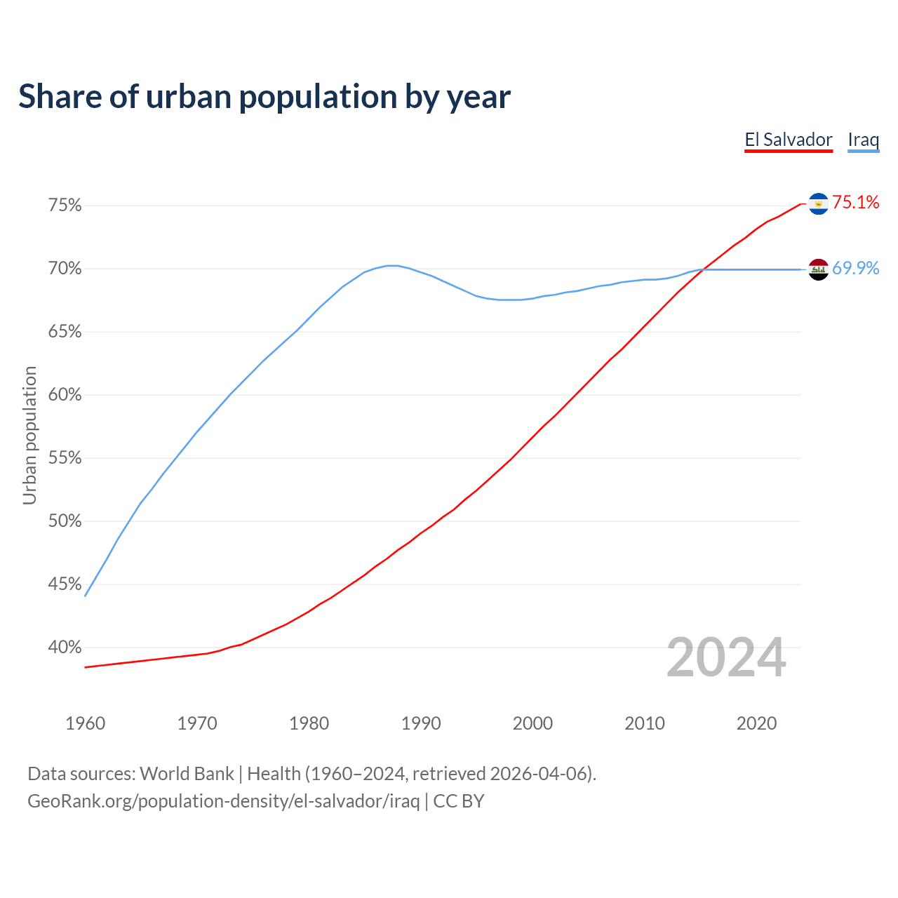 From 2004 to 2024, the share of urban population changed from 60.1% to 75.1% in El Salvador and from 68.2% to 69.9% in Iraq.