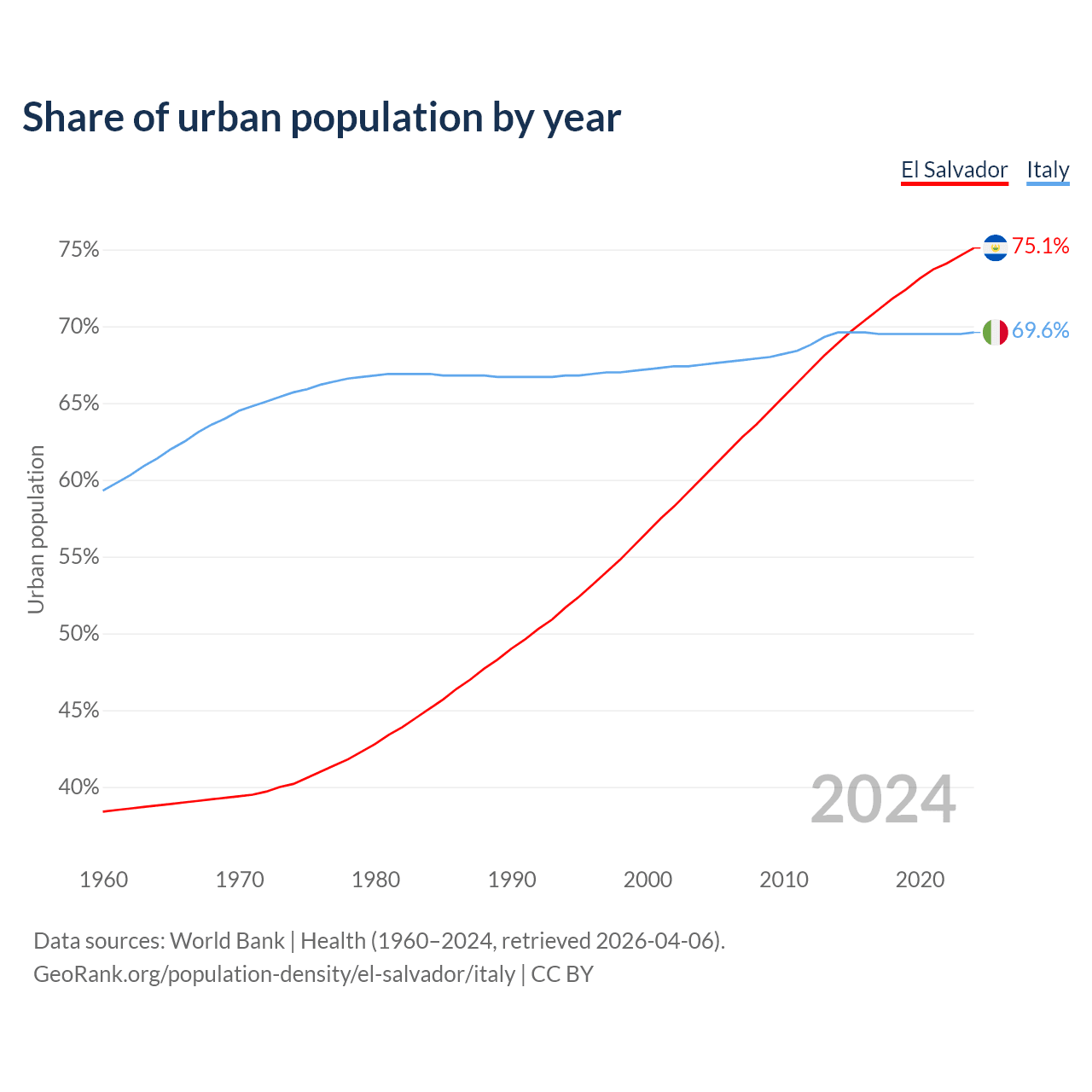 From 2004 to 2024, the share of urban population changed from 60.1% to 75.1% in El Salvador and from 67.5% to 69.6% in Italy.