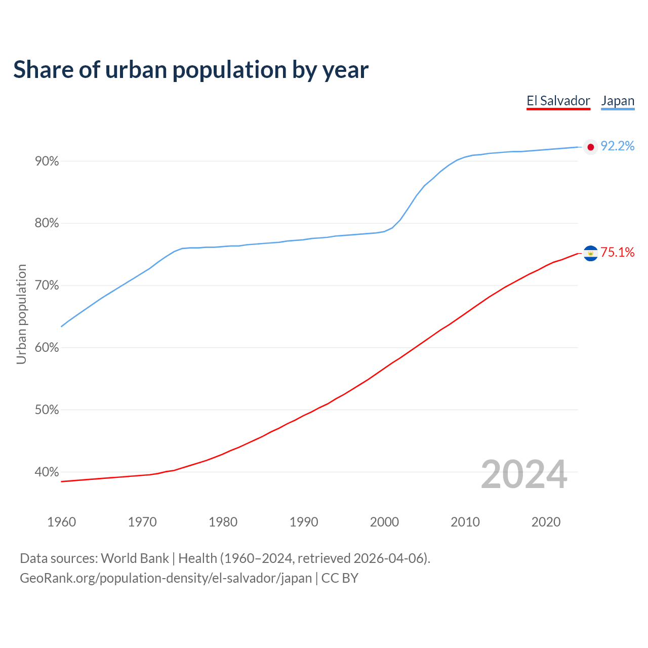 From 2004 to 2024, the share of urban population changed from 60.1% to 75.1% in El Salvador and from 84.4% to 92.2% in Japan.