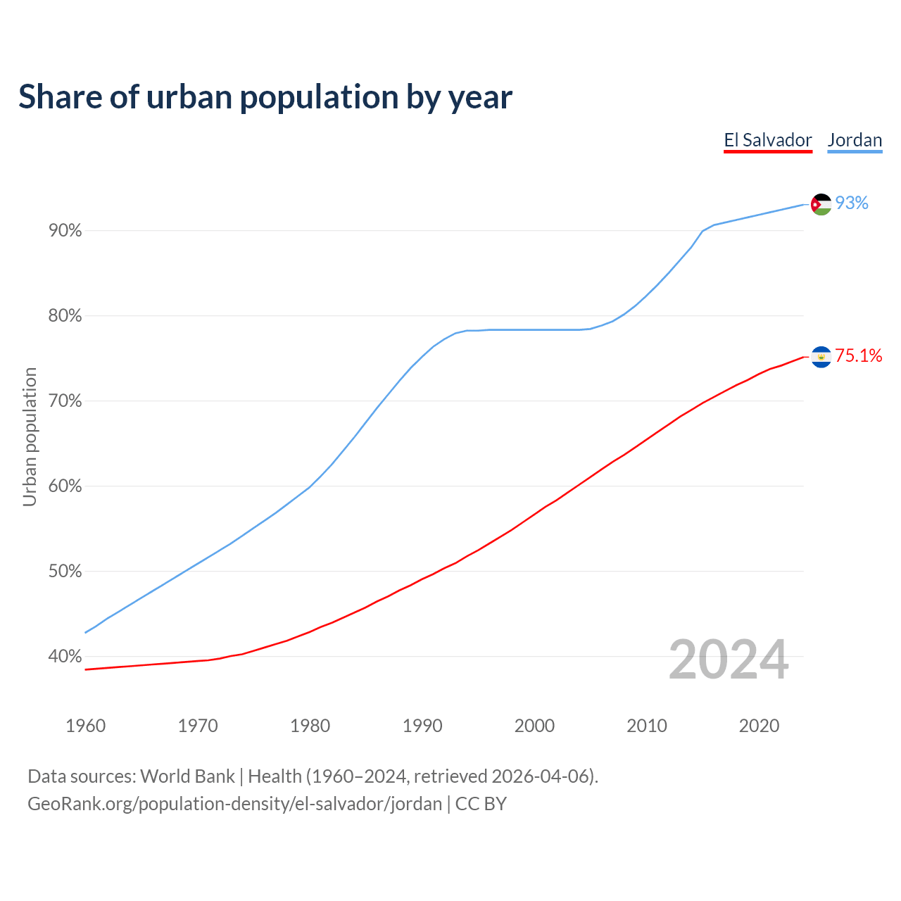 From 2004 to 2024, the share of urban population changed from 60.1% to 75.1% in El Salvador and from 78.3% to 93% in Jordan.