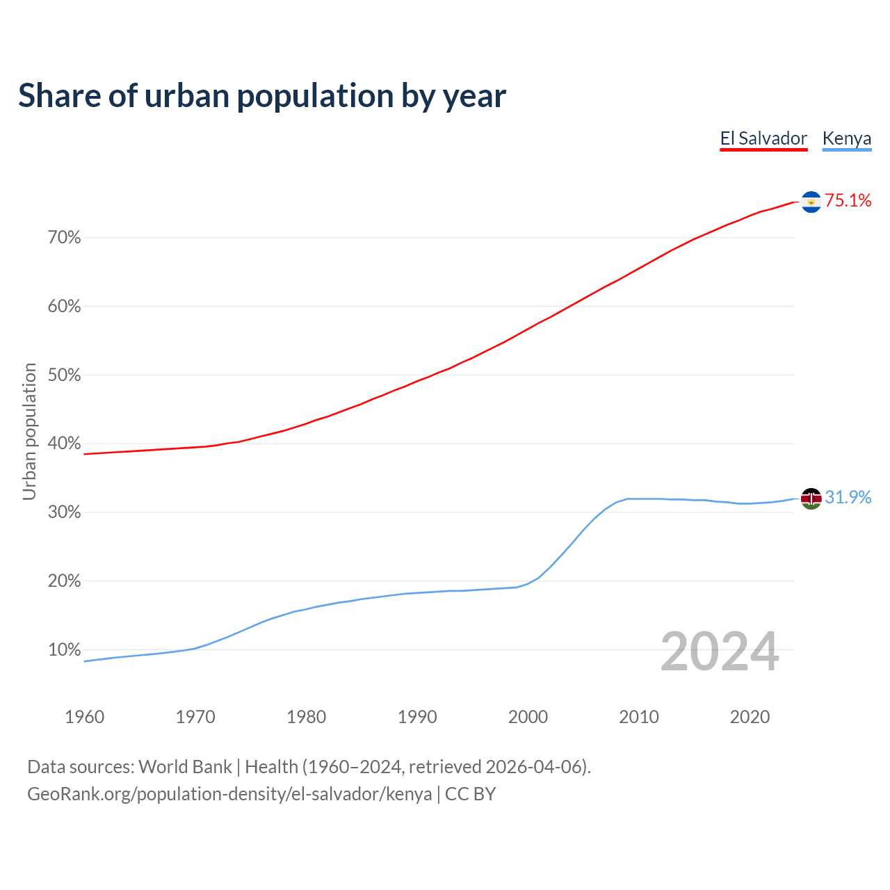 From 2004 to 2024, the share of urban population changed from 60.1% to 75.1% in El Salvador and from 25.4% to 31.9% in Kenya.