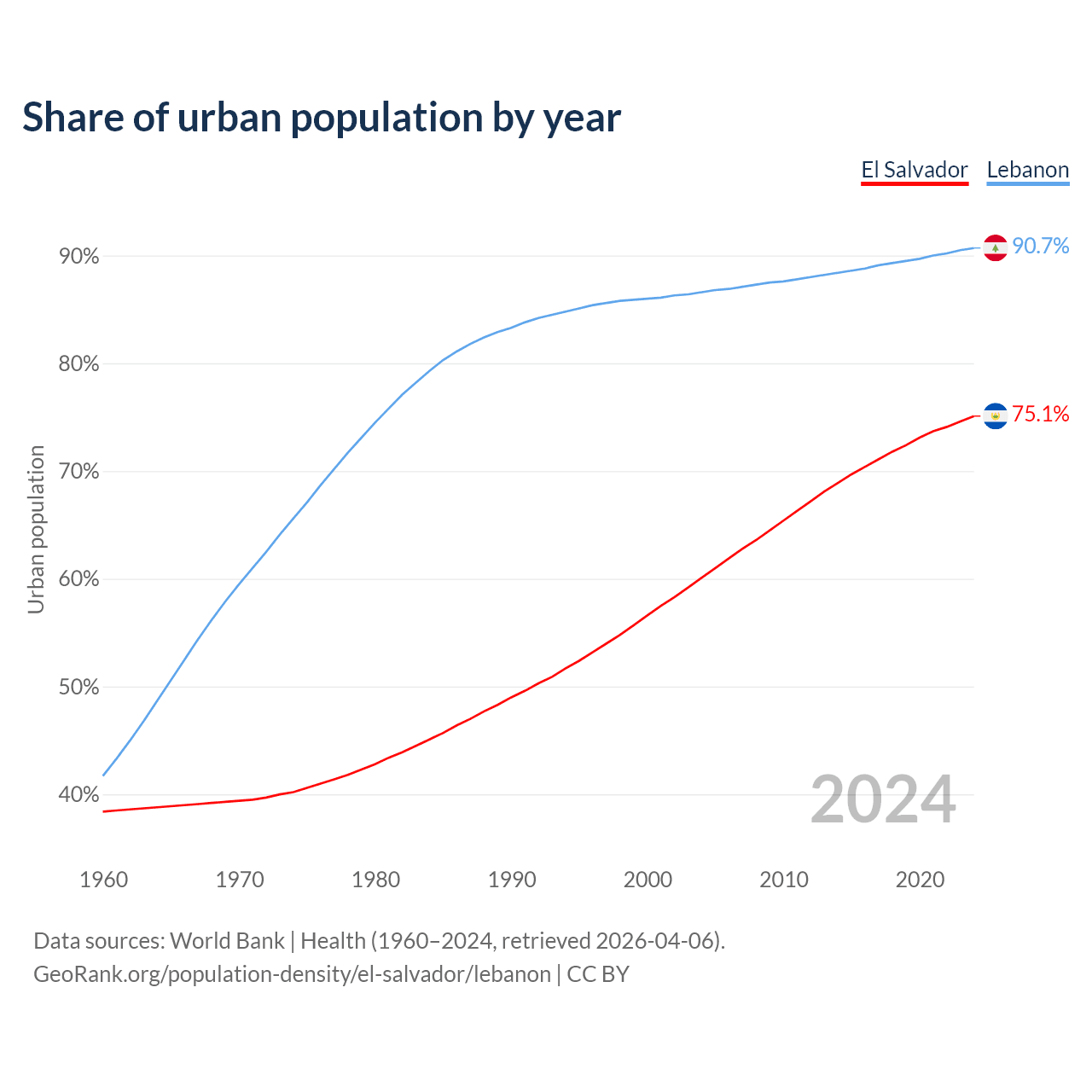 From 2004 to 2024, the share of urban population changed from 60.1% to 75.1% in El Salvador and from 86.6% to 90.7% in Lebanon.