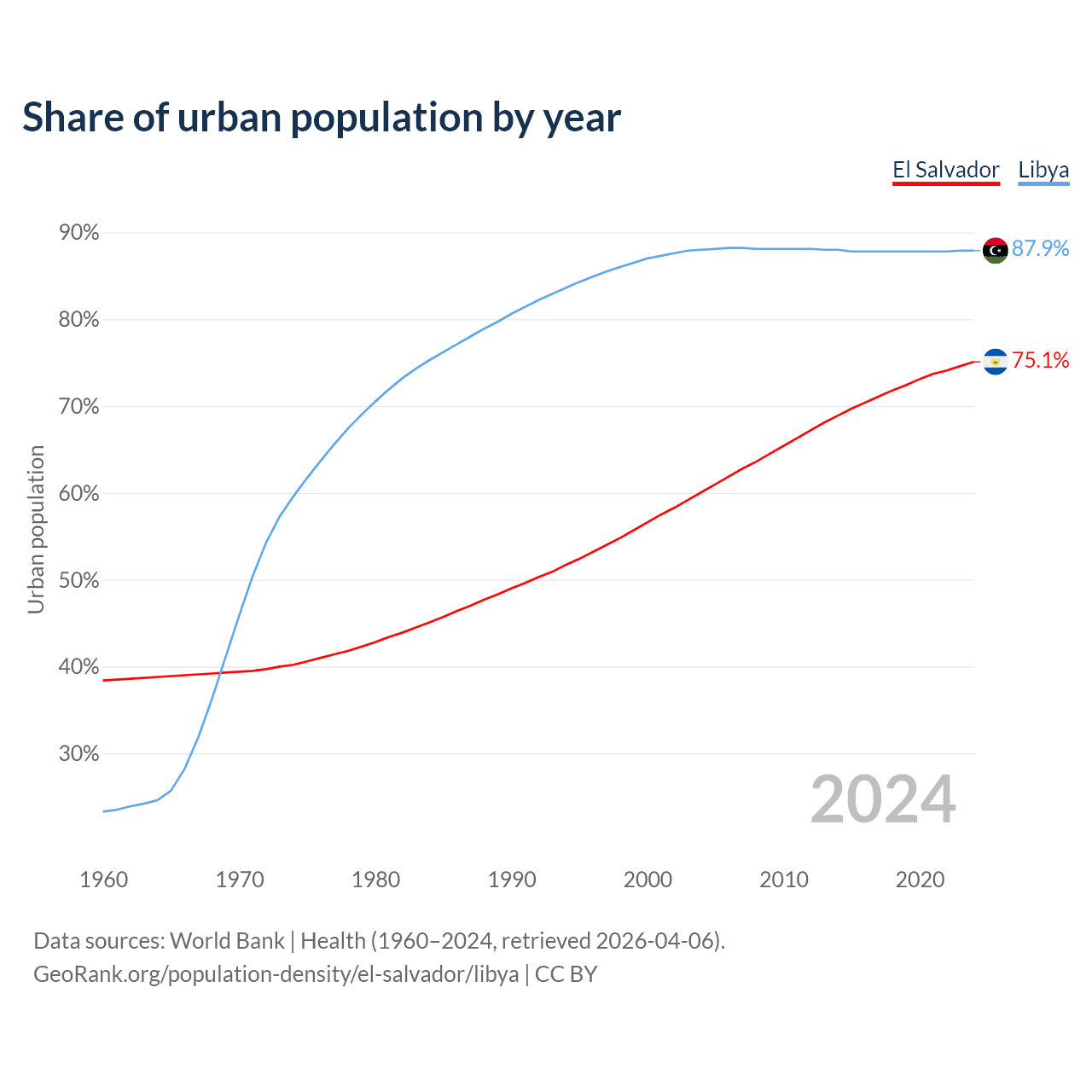 From 2004 to 2024, the share of urban population changed from 60.1% to 75.1% in El Salvador and from 88% to 87.9% in Libya.
