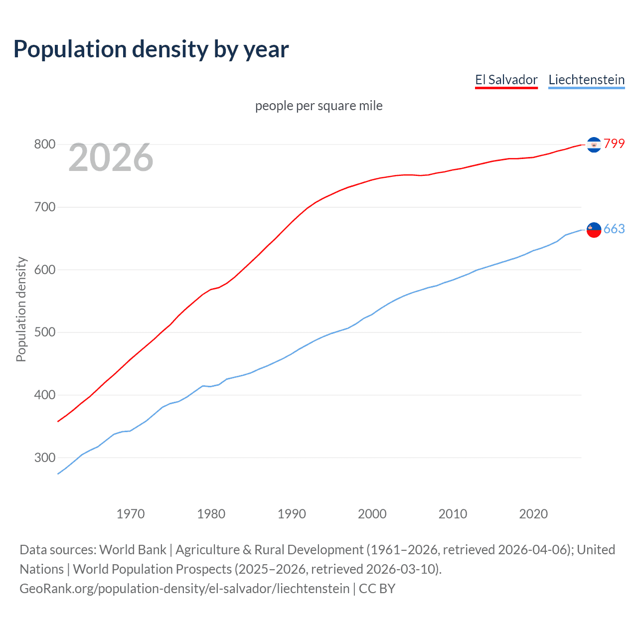 From 2006 to 2026, population density in El Salvador increased by 6.51%, compared to a 16.9% growth in Liechtenstein.