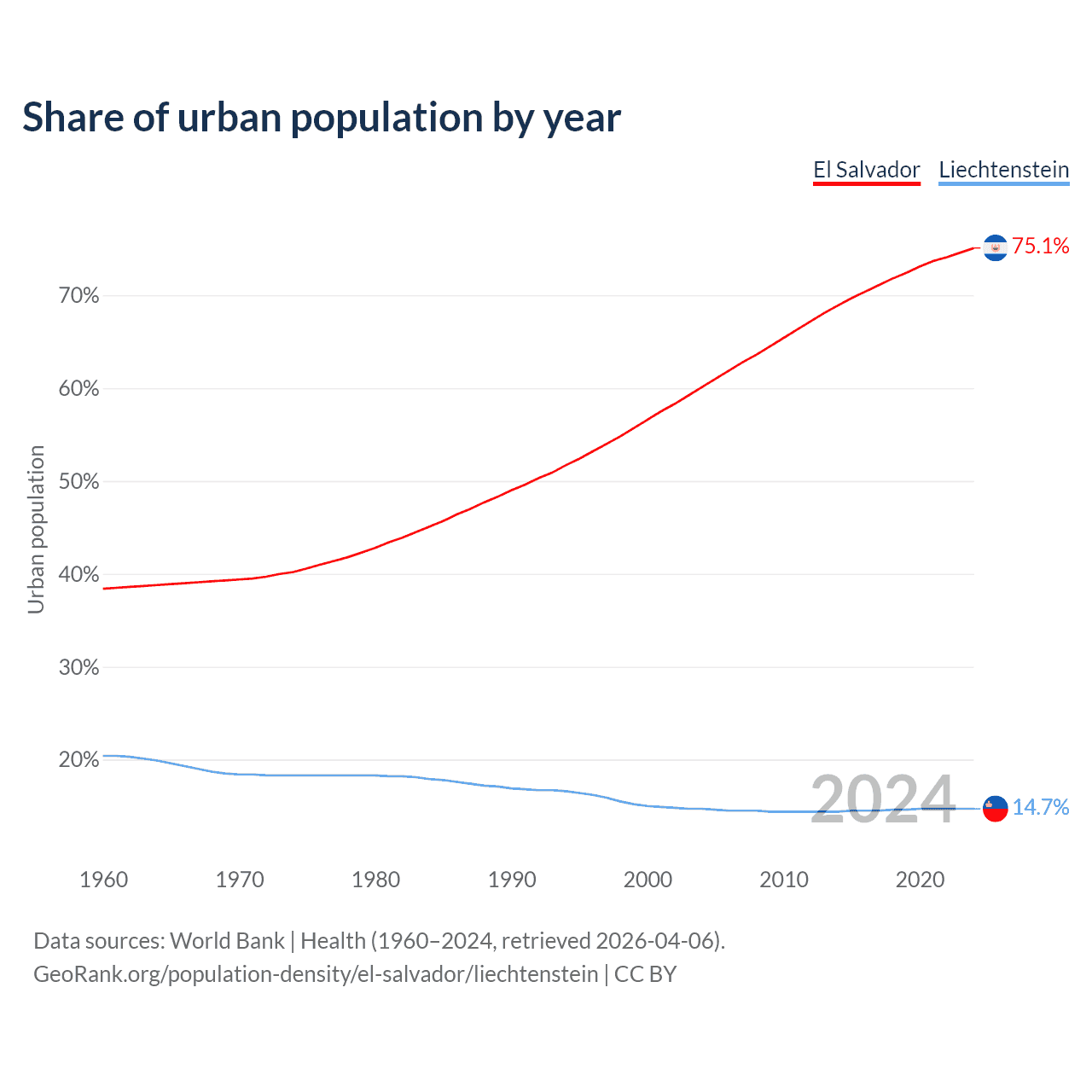 From 2004 to 2024, the share of urban population changed from 60.1% to 75.1% in El Salvador and from 14.7% to 14.7% in Liechtenstein.