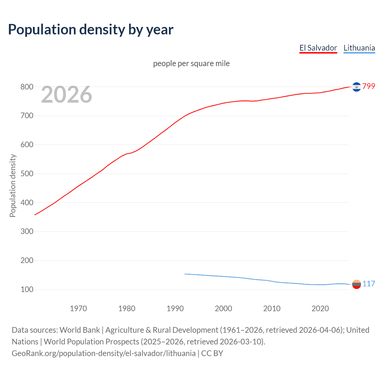 From 2006 to 2026, population density in El Salvador increased by 6.51%, compared to a 13.3% decline in Lithuania.