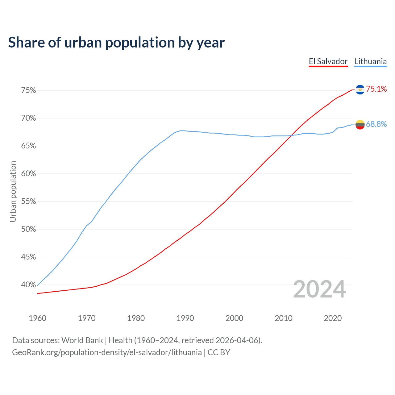 From 2004 to 2024, the share of urban population changed from 60.1% to 75.1% in El Salvador and from 66.6% to 68.8% in Lithuania.