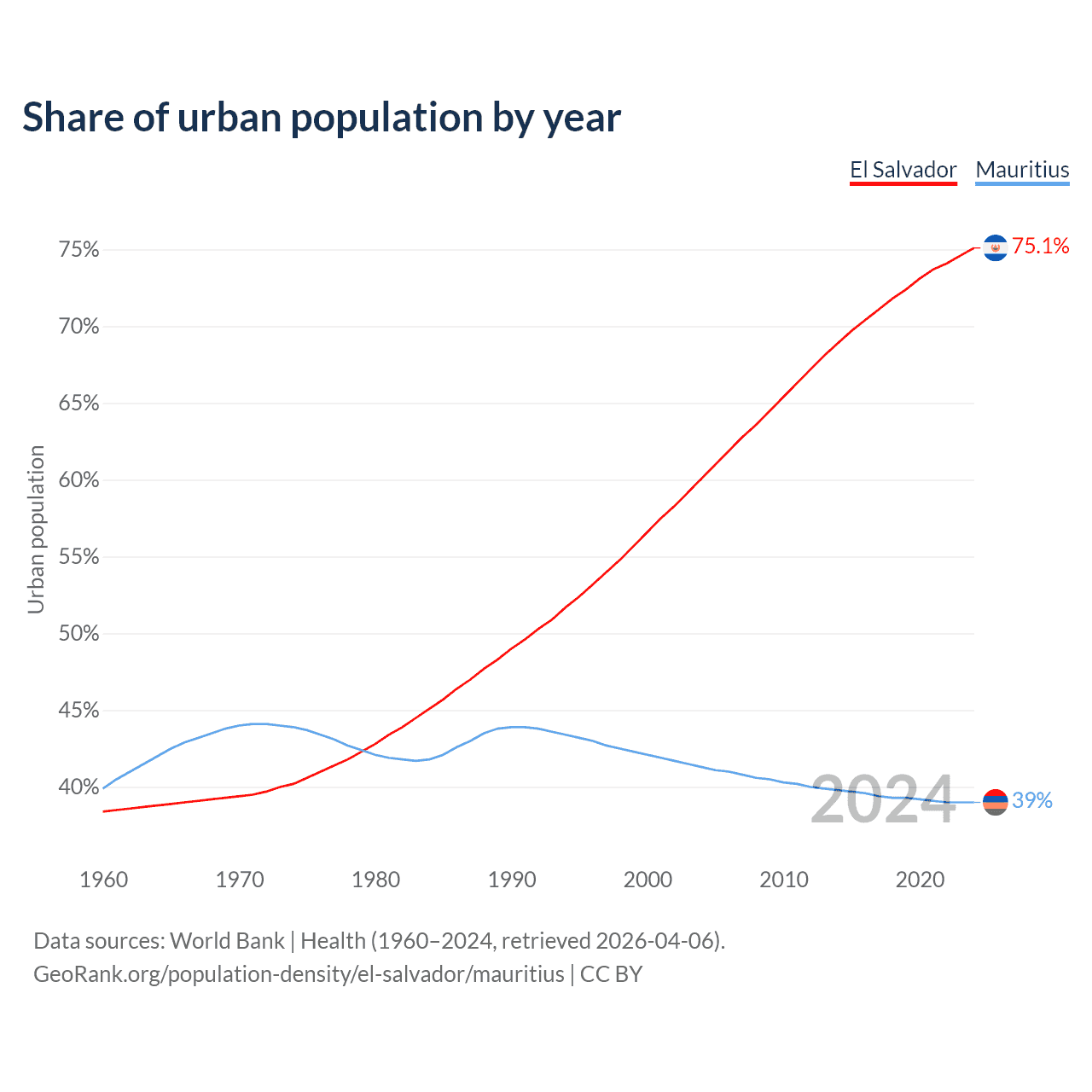 From 2004 to 2024, the share of urban population changed from 60.1% to 75.1% in El Salvador and from 41.3% to 39% in Mauritius.