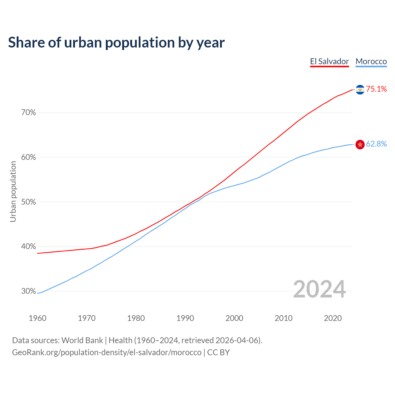 From 2004 to 2024, the share of urban population changed from 60.1% to 75.1% in El Salvador and from 55% to 62.8% in Morocco.