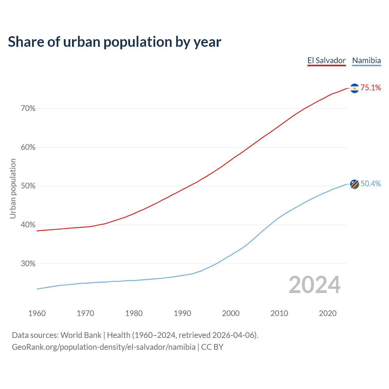 From 2004 to 2024, the share of urban population changed from 60.1% to 75.1% in El Salvador and from 35.5% to 50.4% in Namibia.