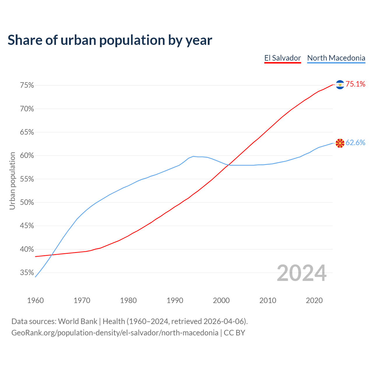From 2004 to 2024, the share of urban population changed from 60.1% to 75.1% in El Salvador and from 57.9% to 62.6% in North Macedonia.