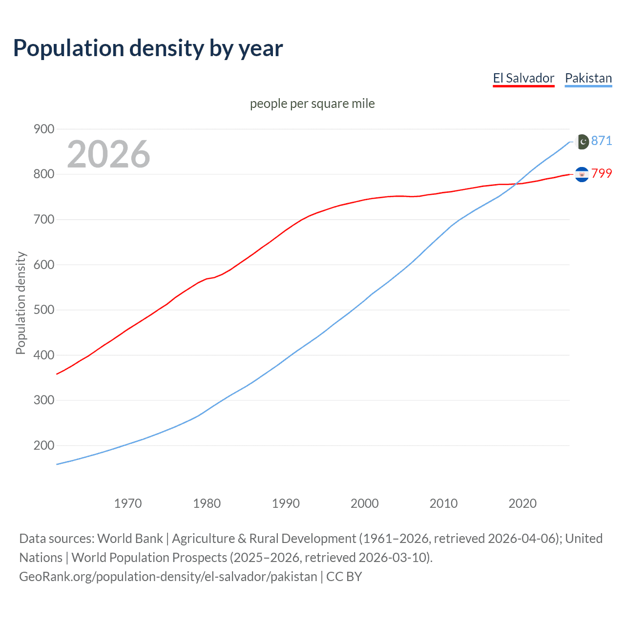 From 2006 to 2026, population density in El Salvador increased by 6.51%, compared to a 44.3% growth in Pakistan.