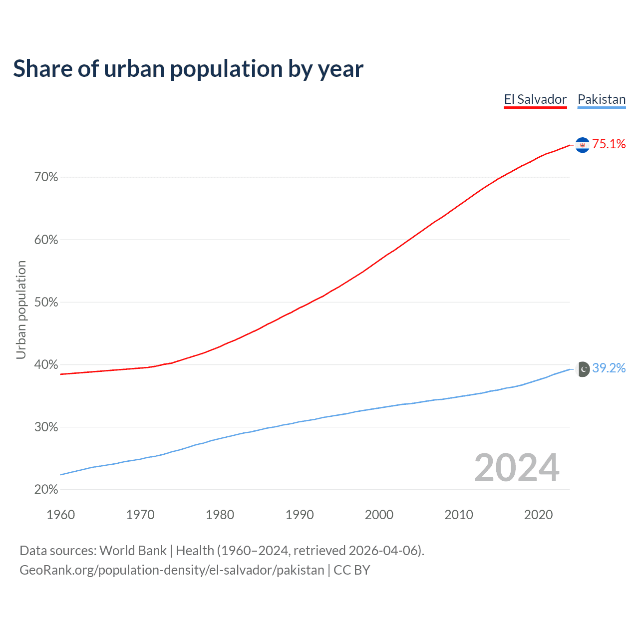 From 2004 to 2024, the share of urban population changed from 60.1% to 75.1% in El Salvador and from 33.7% to 39.2% in Pakistan.