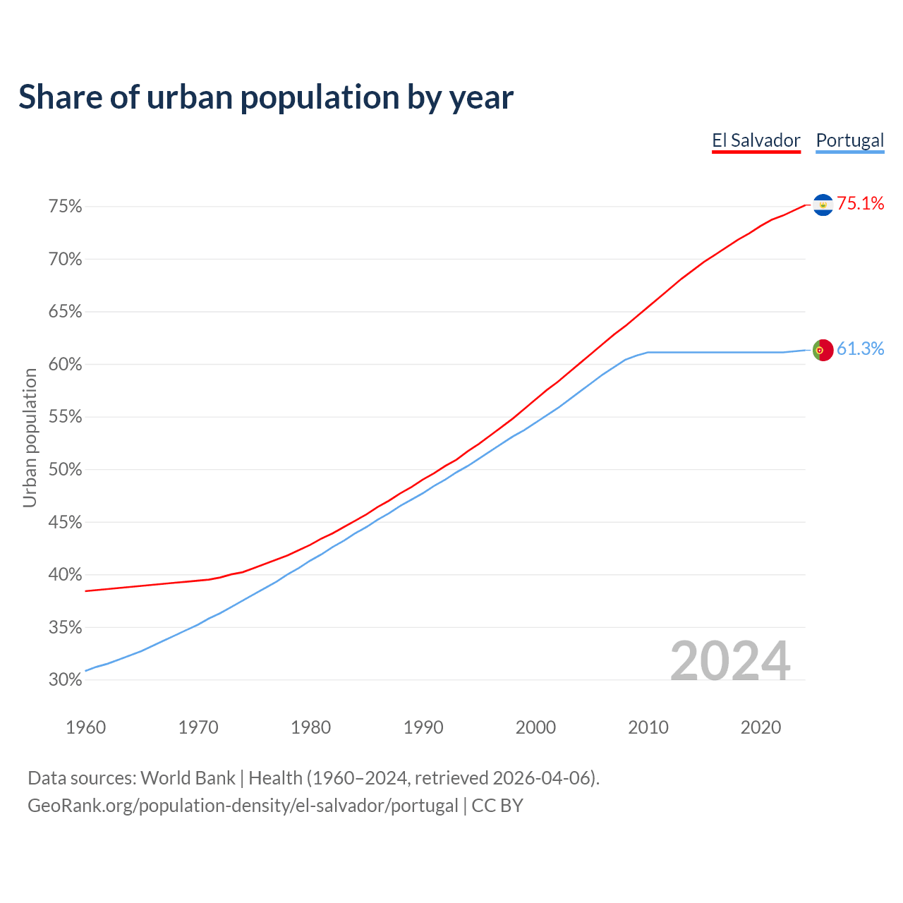 From 2004 to 2024, the share of urban population changed from 60.1% to 75.1% in El Salvador and from 57.4% to 61.3% in Portugal.