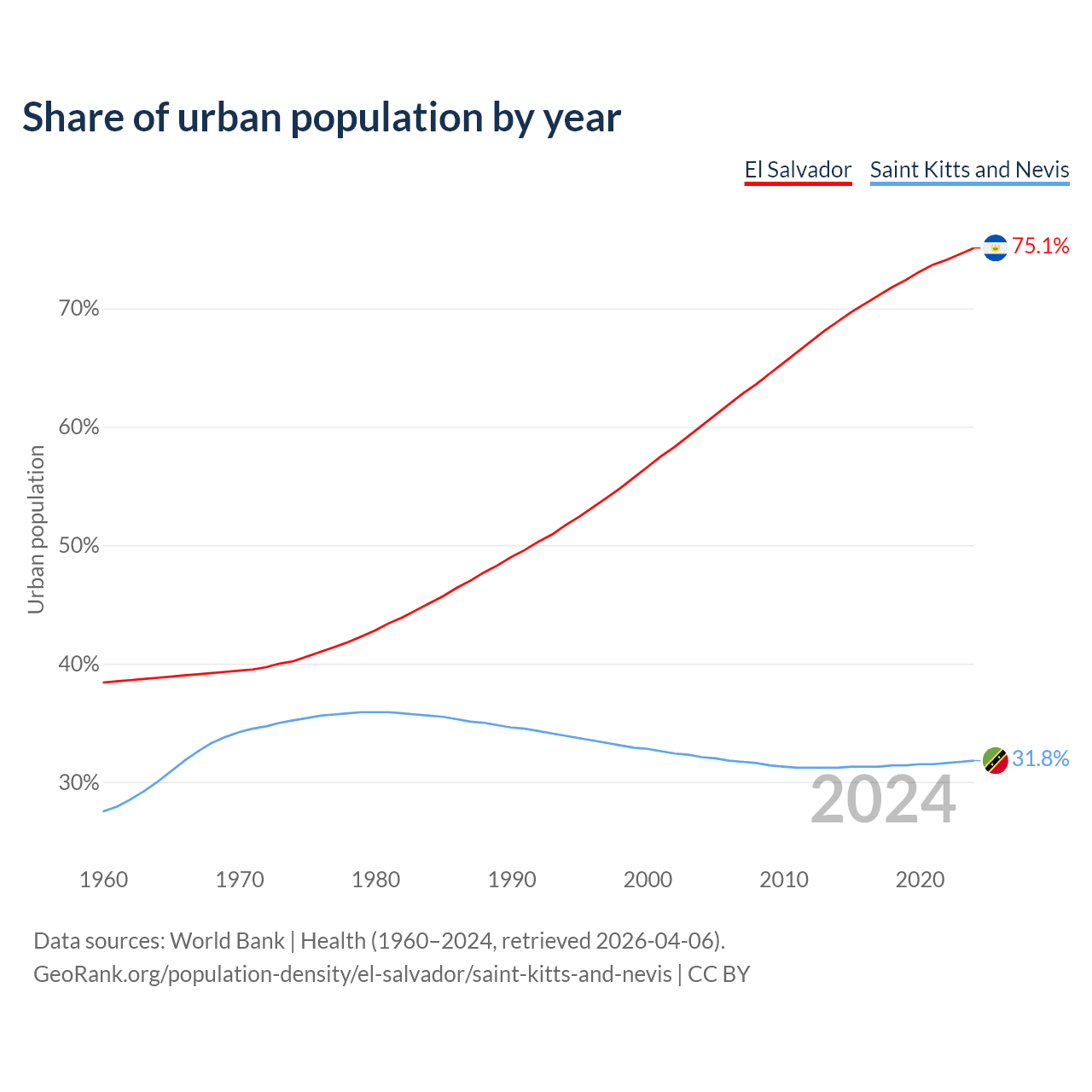 From 2004 to 2024, the share of urban population changed from 60.1% to 75.1% in El Salvador and from 32.1% to 31.8% in Saint Kitts and Nevis.