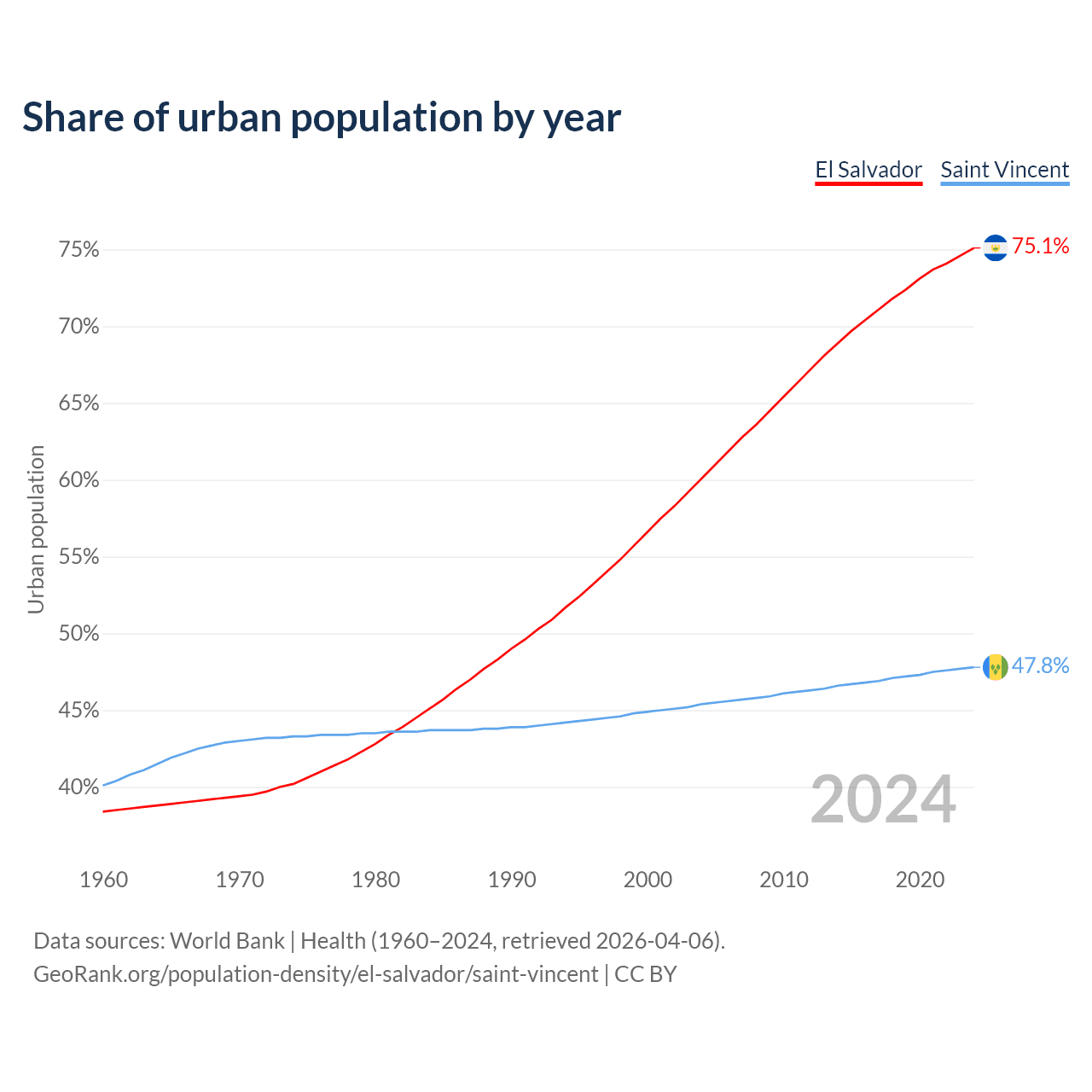 From 2004 to 2024, the share of urban population changed from 60.1% to 75.1% in El Salvador and from 45.4% to 47.8% in Saint Vincent.
