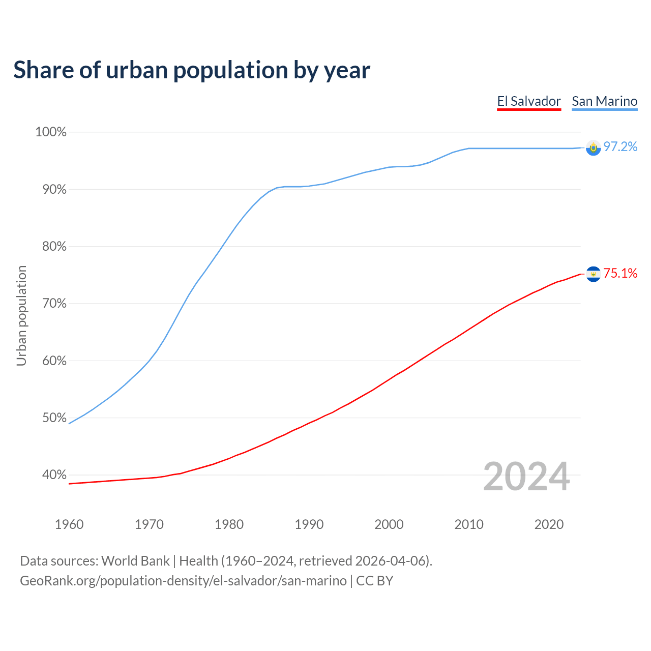 From 2004 to 2024, the share of urban population changed from 60.1% to 75.1% in El Salvador and from 94.2% to 97.2% in San Marino.