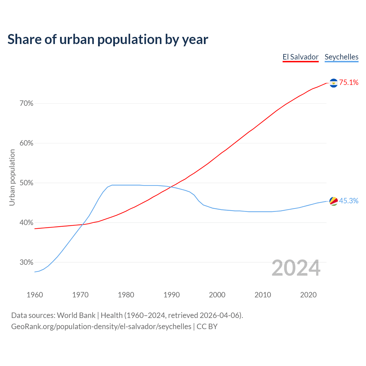From 2004 to 2024, the share of urban population changed from 60.1% to 75.1% in El Salvador and from 42.9% to 45.3% in the Seychelles.