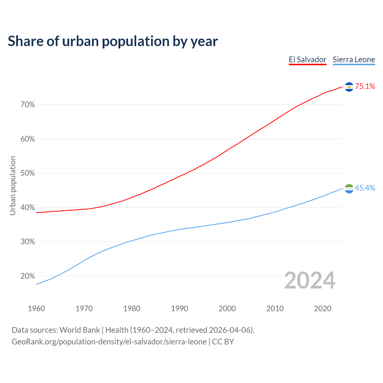 From 2004 to 2024, the share of urban population changed from 60.1% to 75.1% in El Salvador and from 36.5% to 45.4% in Sierra Leone.