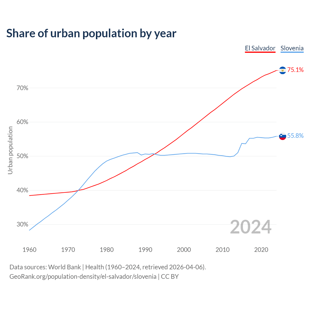 From 2004 to 2024, the share of urban population changed from 60.1% to 75.1% in El Salvador and from 50.7% to 55.8% in Slovenia.