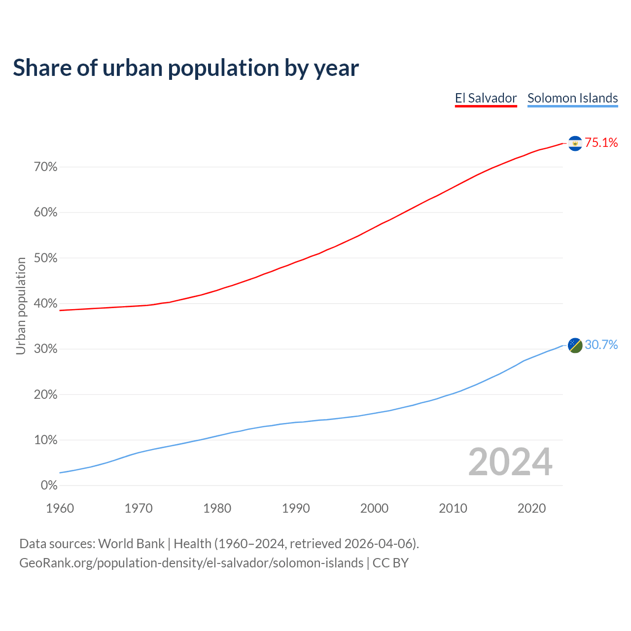 From 2004 to 2024, the share of urban population changed from 60.1% to 75.1% in El Salvador and from 17.2% to 30.7% in the Solomon Islands.