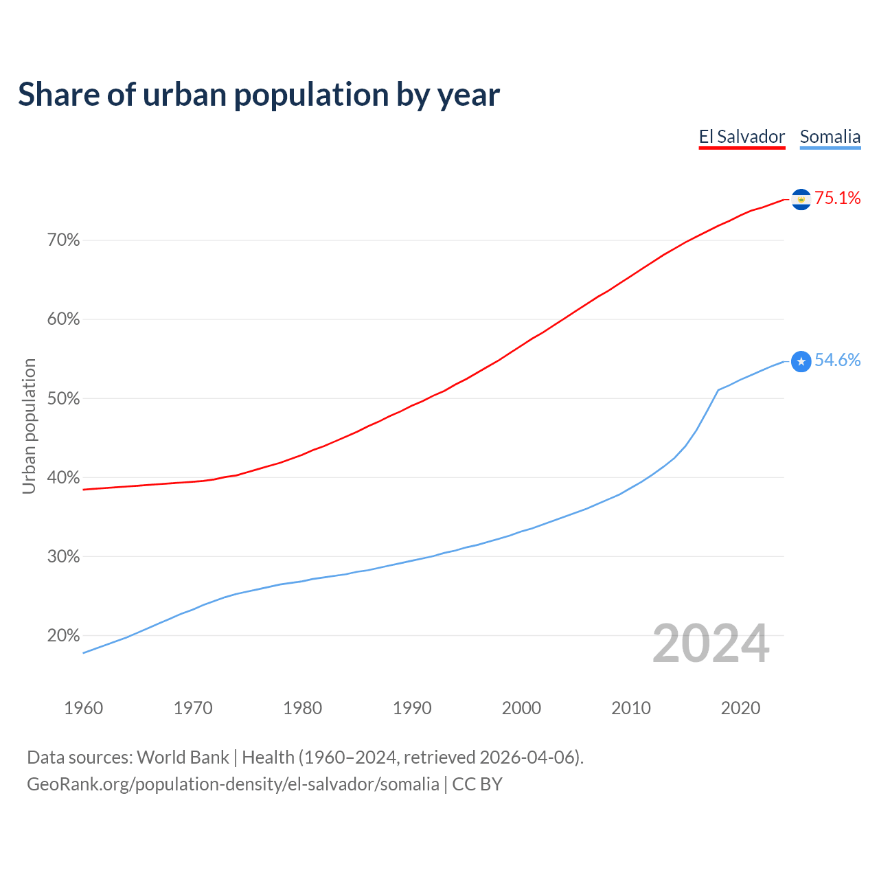 From 2004 to 2024, the share of urban population changed from 60.1% to 75.1% in El Salvador and from 35% to 54.6% in Somalia.