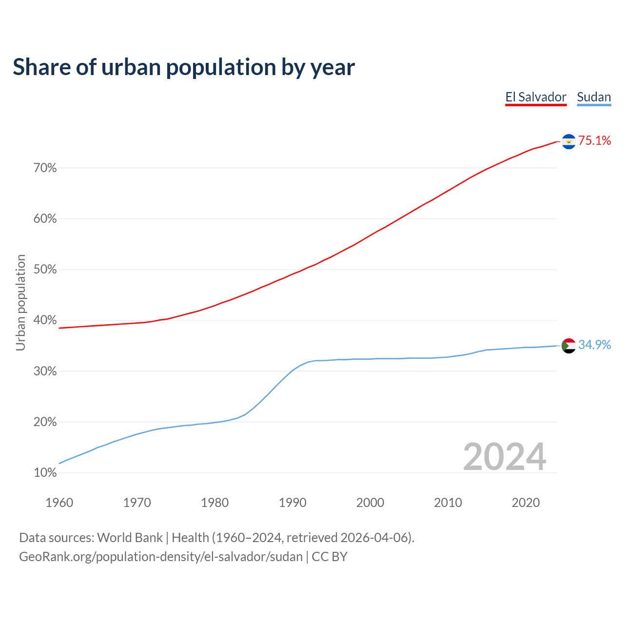 From 2004 to 2024, the share of urban population changed from 60.1% to 75.1% in El Salvador and from 32.4% to 34.9% in Sudan.