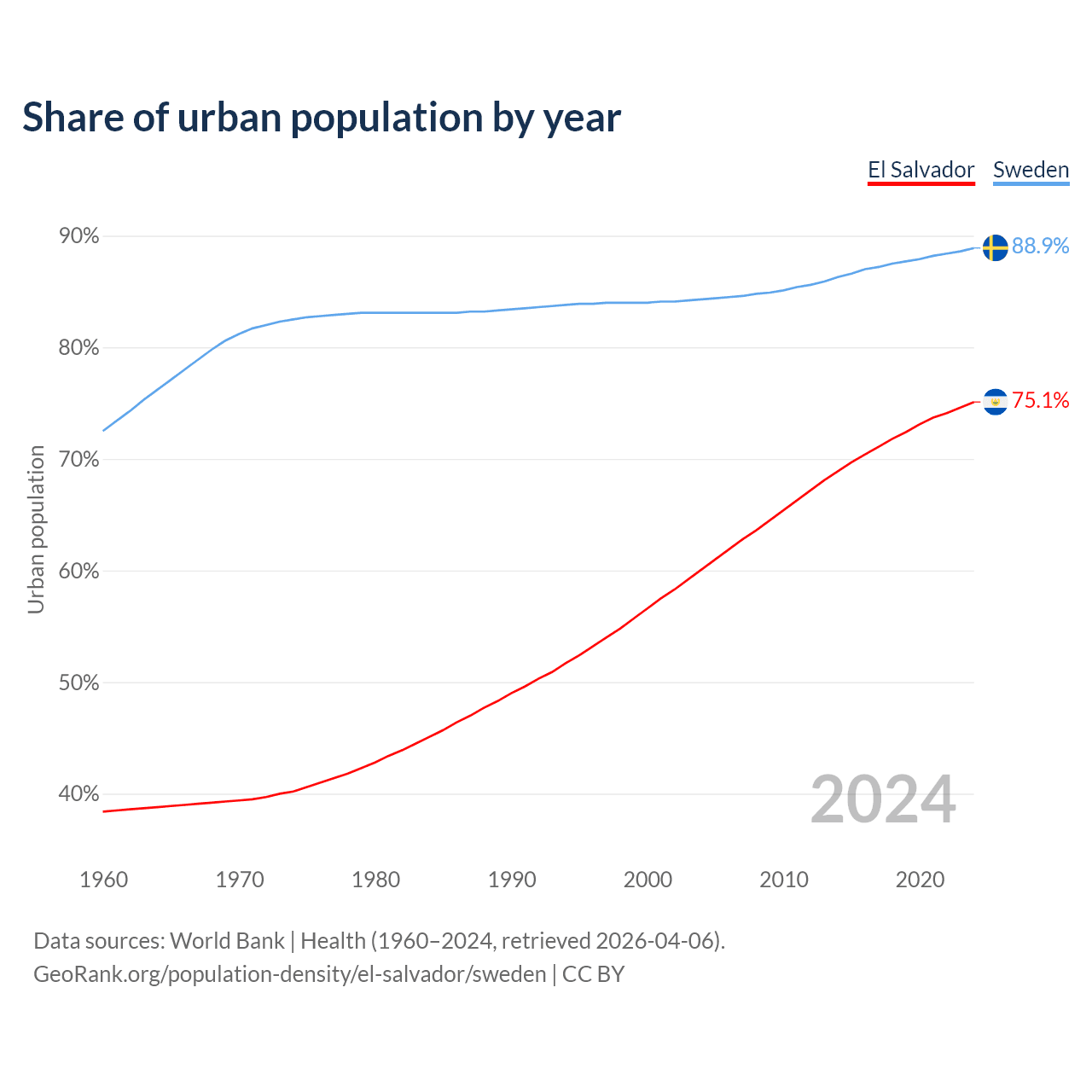 From 2004 to 2024, the share of urban population changed from 60.1% to 75.1% in El Salvador and from 84.3% to 88.9% in Sweden.