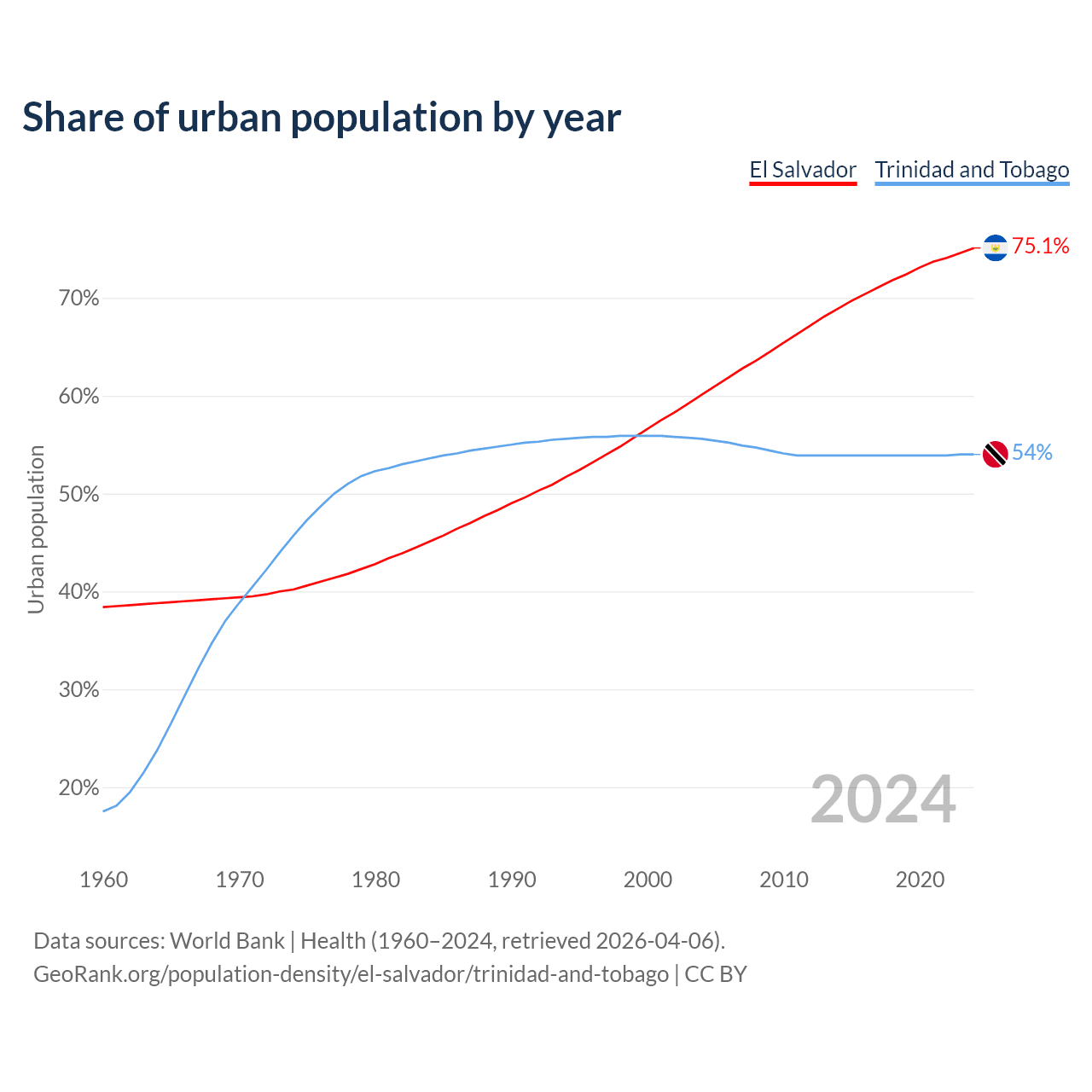 From 2004 to 2024, the share of urban population changed from 60.1% to 75.1% in El Salvador and from 55.6% to 54% in Trinidad and Tobago.