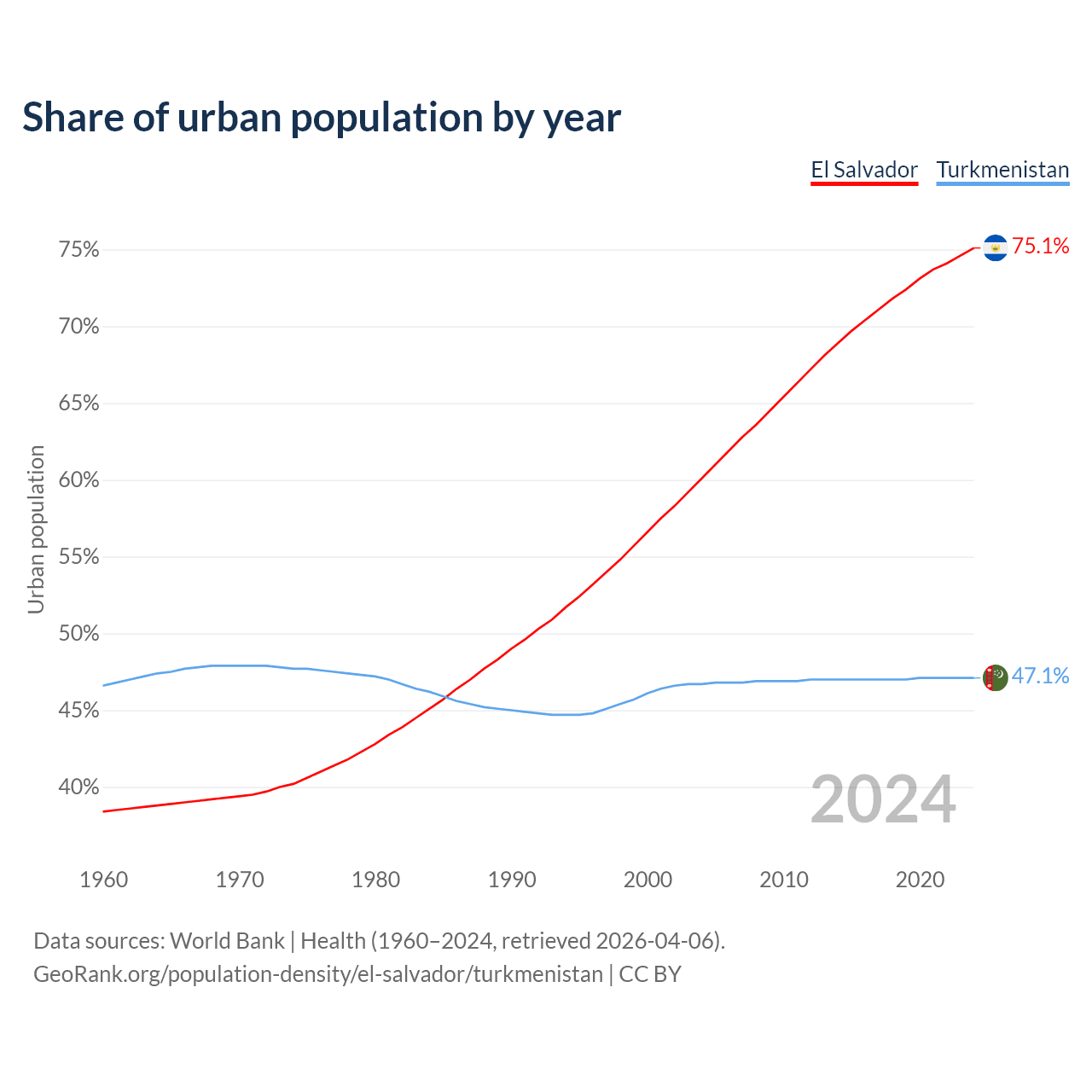 From 2004 to 2024, the share of urban population changed from 60.1% to 75.1% in El Salvador and from 46.7% to 47.1% in Turkmenistan.