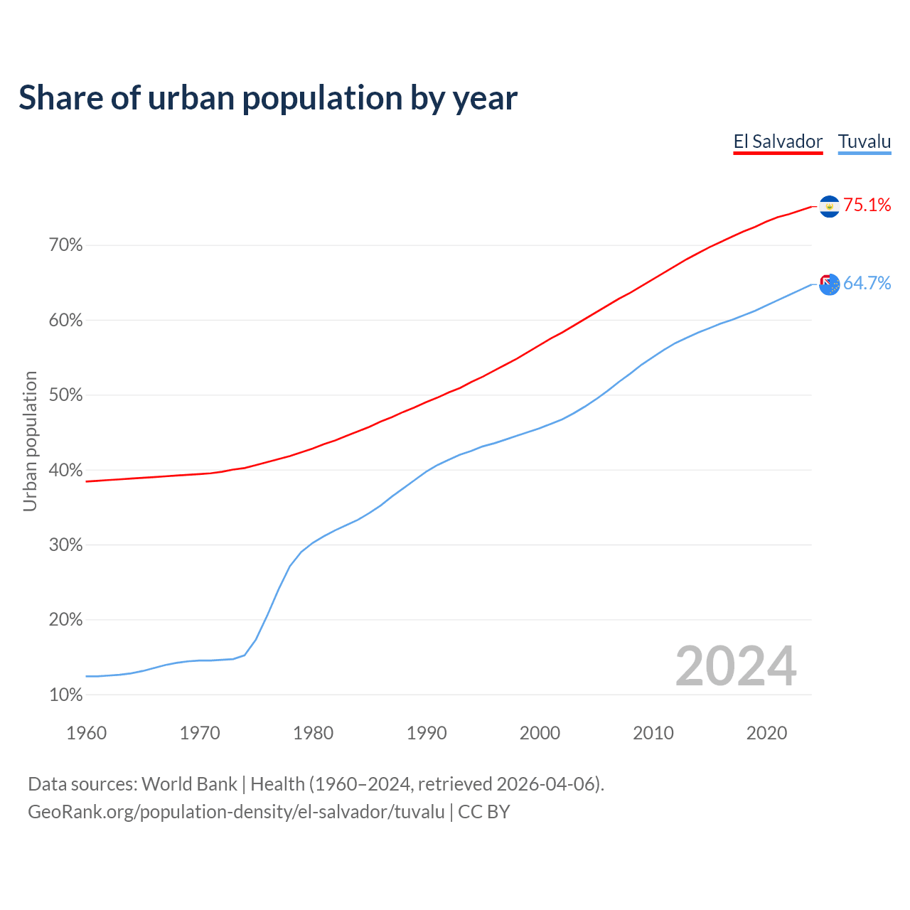 From 2004 to 2024, the share of urban population changed from 60.1% to 75.1% in El Salvador and from 48.4% to 64.7% in Tuvalu.
