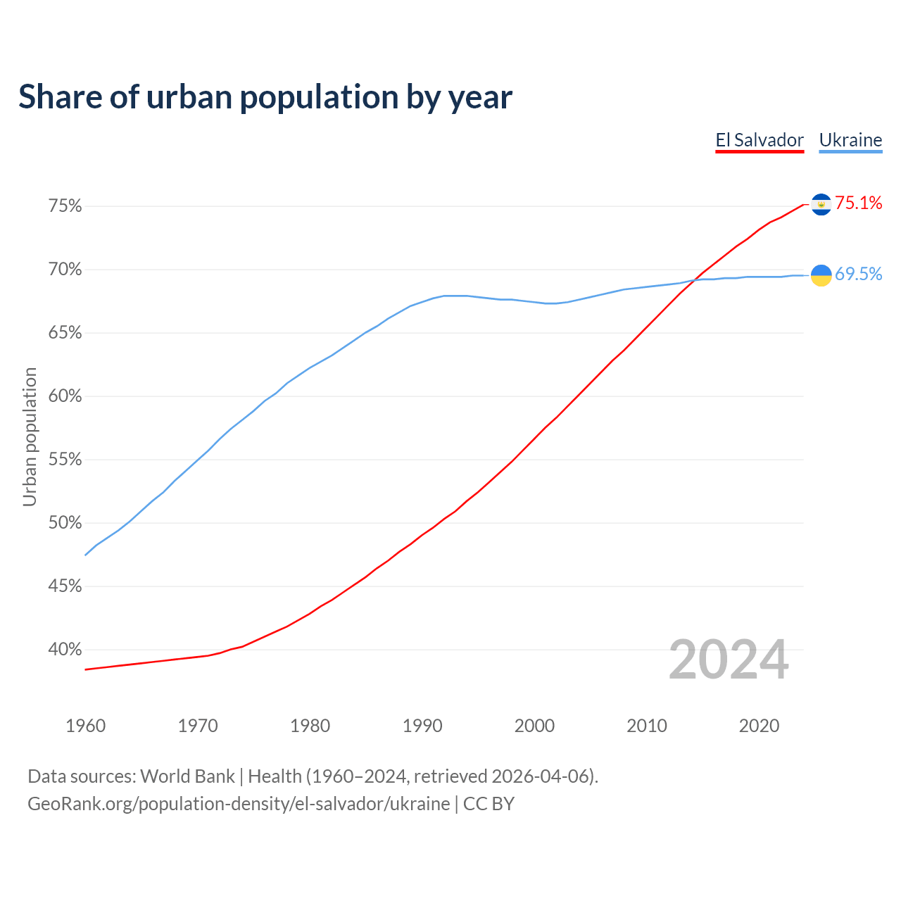From 2004 to 2024, the share of urban population changed from 60.1% to 75.1% in El Salvador and from 67.6% to 69.5% in Ukraine.