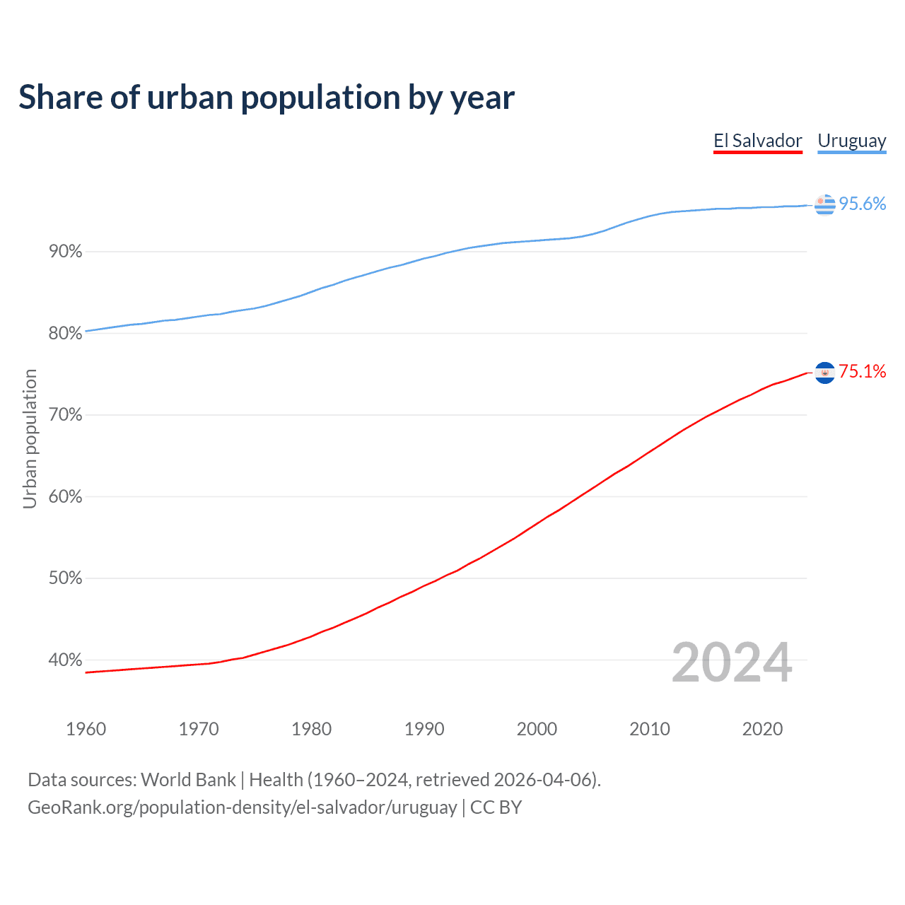 From 2004 to 2024, the share of urban population changed from 60.1% to 75.1% in El Salvador and from 91.8% to 95.6% in Uruguay.