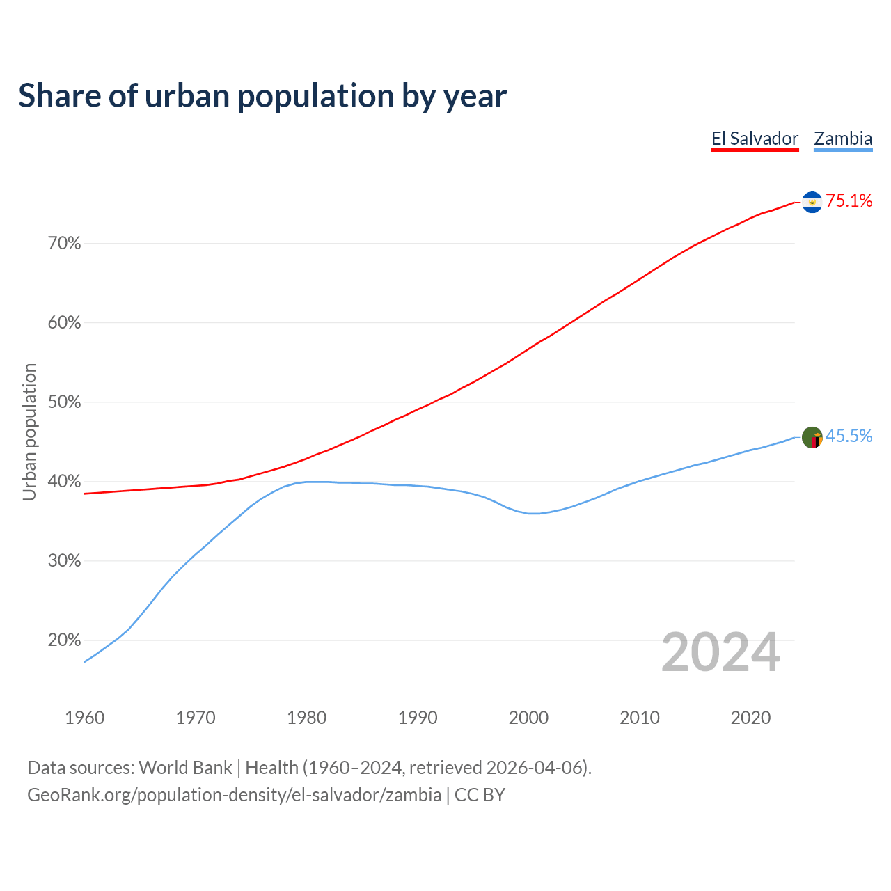 From 2004 to 2024, the share of urban population changed from 60.1% to 75.1% in El Salvador and from 36.8% to 45.5% in Zambia.