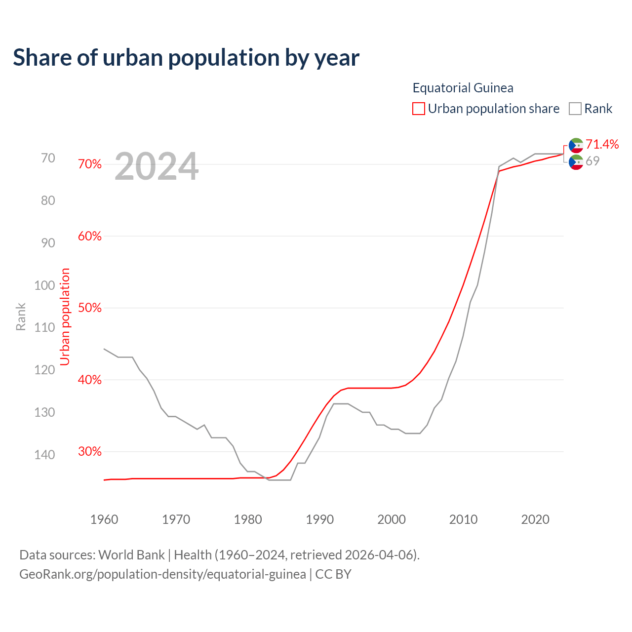 This chart shows the share of urban population in Equatorial Guinea from 1960 to 2024: 26% lived in urban areas in 1960, 38.8% in 2000, and 71.4% in 2024.