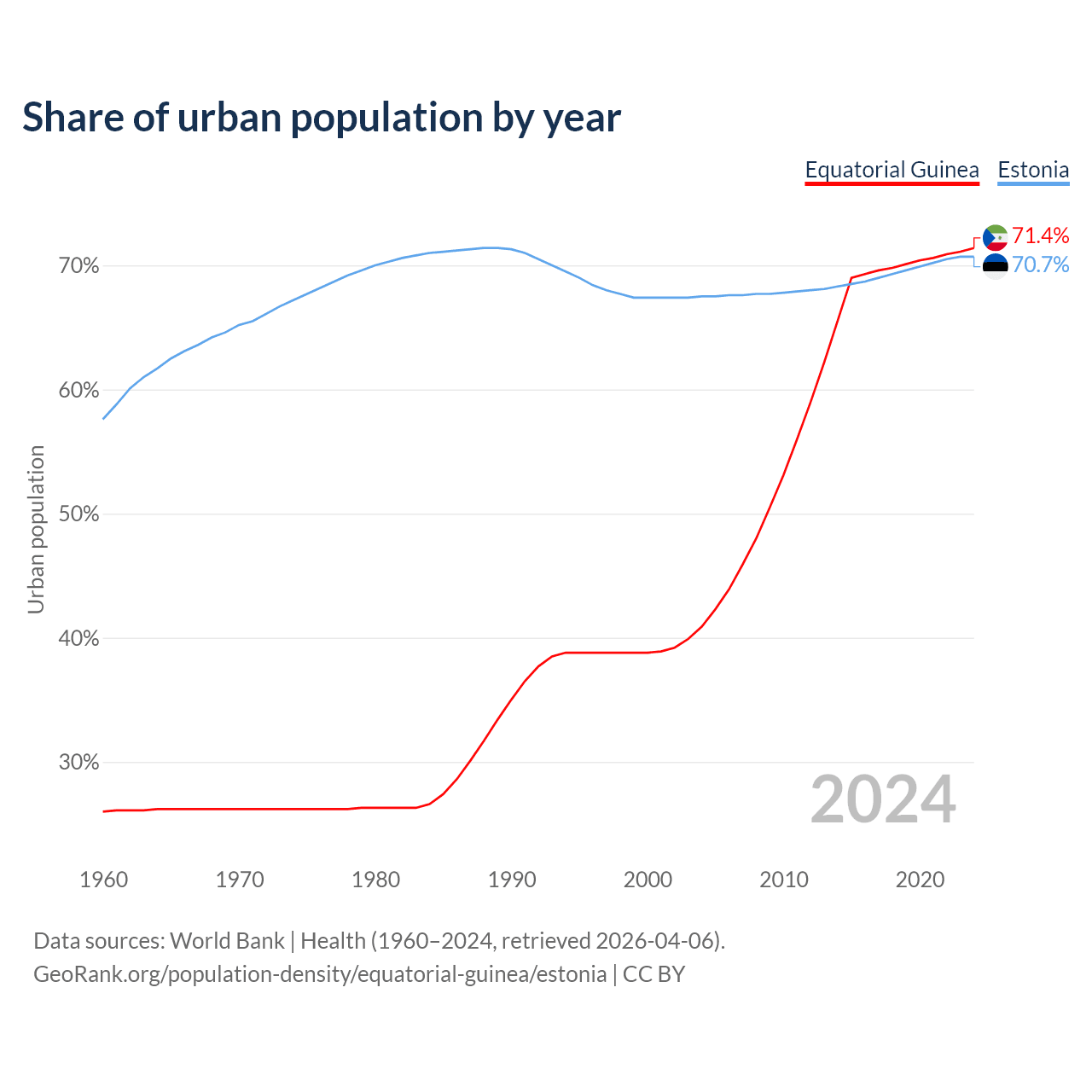 From 2004 to 2024, the share of urban population changed from 40.9% to 71.4% in Equatorial Guinea and from 67.5% to 70.7% in Estonia.