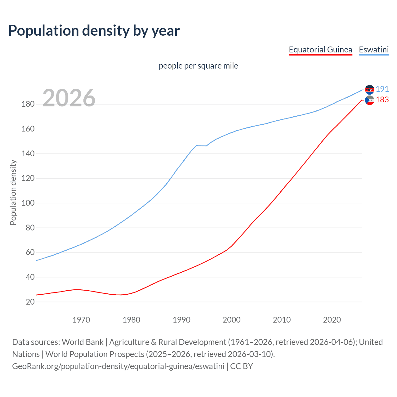 From 2006 to 2026, population density in Equatorial Guinea increased by 100.5%, compared to a 17.1% growth in Eswatini.