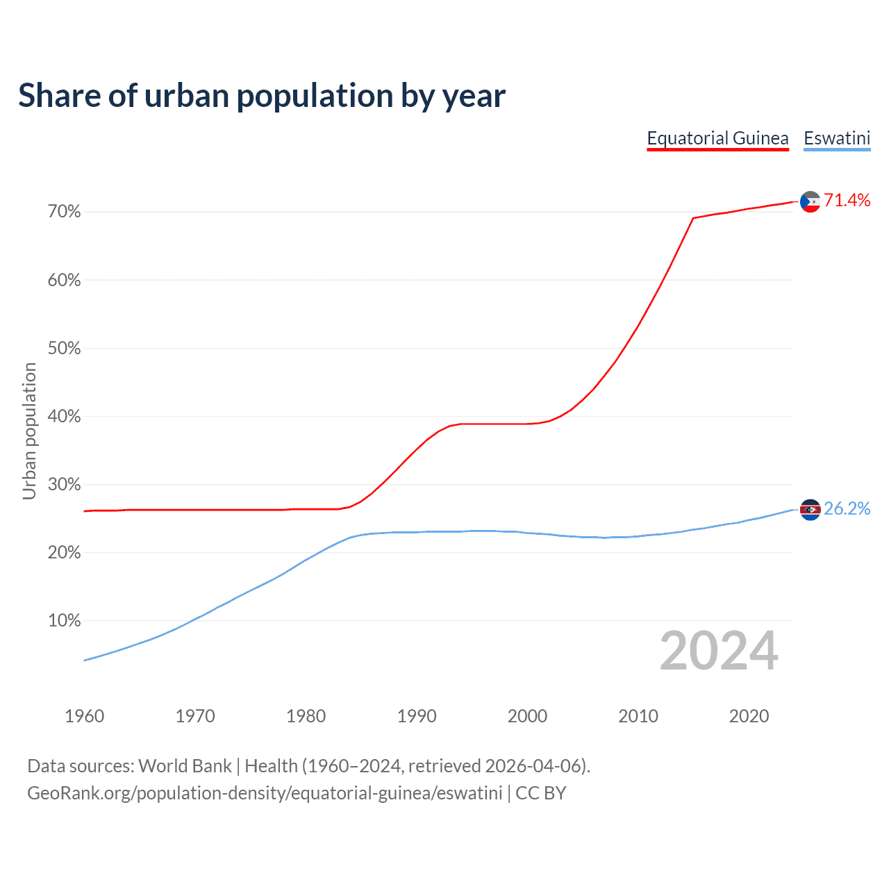 From 2004 to 2024, the share of urban population changed from 40.9% to 71.4% in Equatorial Guinea and from 22.3% to 26.2% in Eswatini.