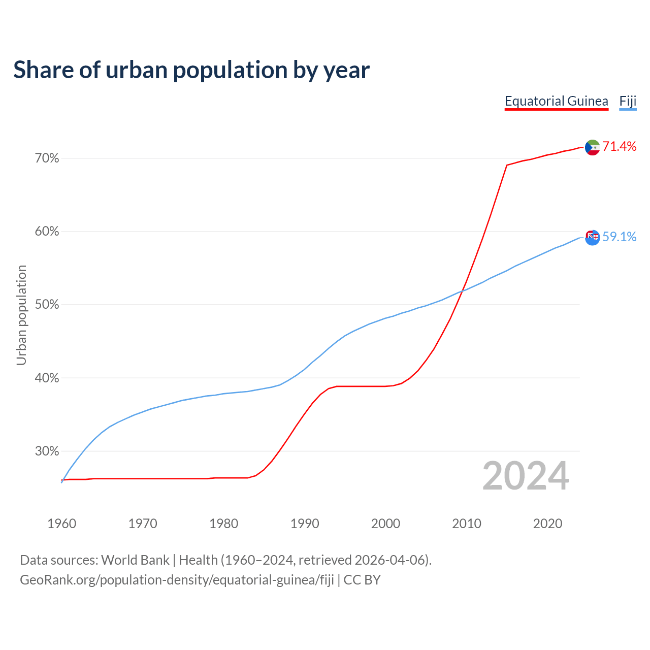 From 2004 to 2024, the share of urban population changed from 40.9% to 71.4% in Equatorial Guinea and from 49.5% to 59.1% in Fiji.