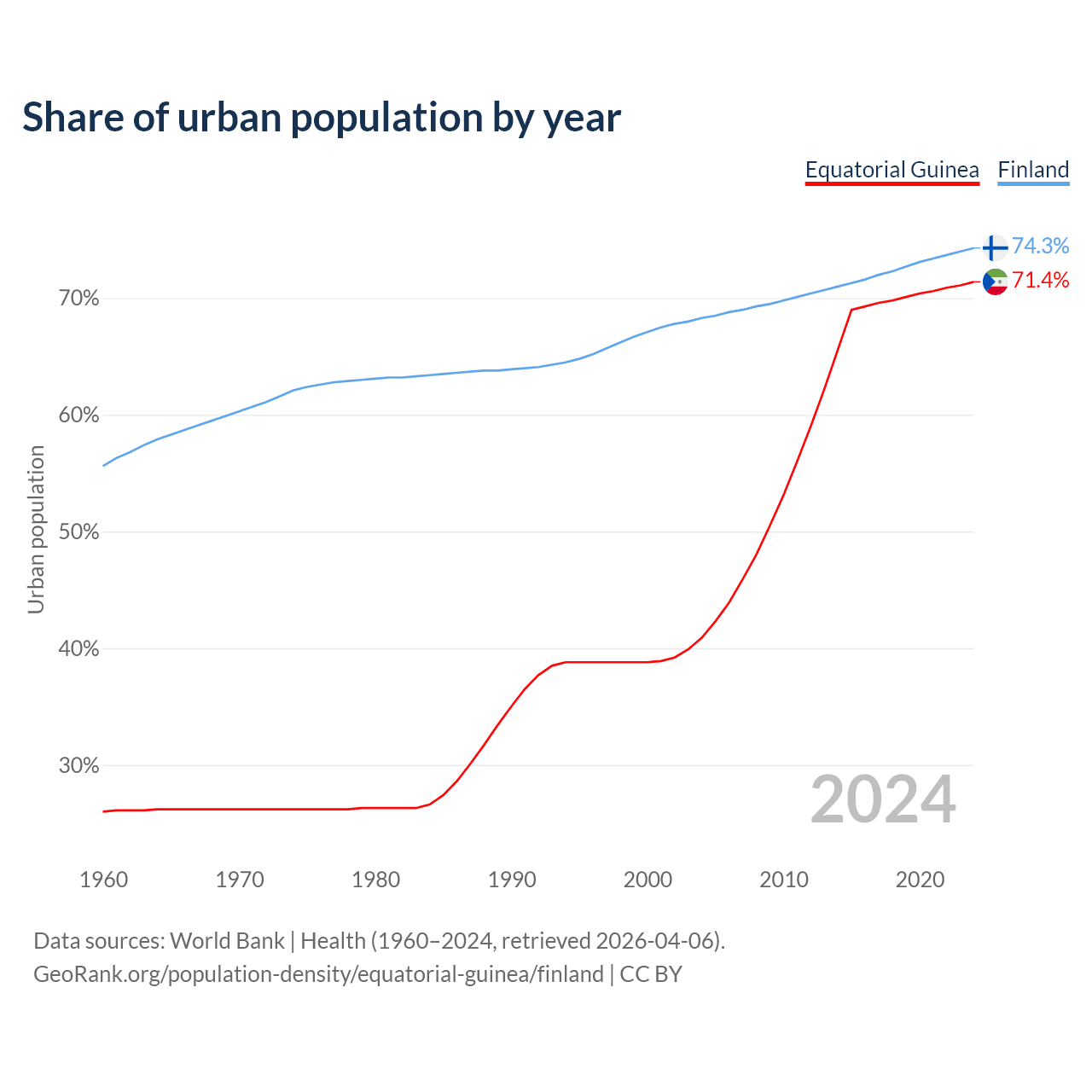 From 2004 to 2024, the share of urban population changed from 40.9% to 71.4% in Equatorial Guinea and from 68.3% to 74.3% in Finland.