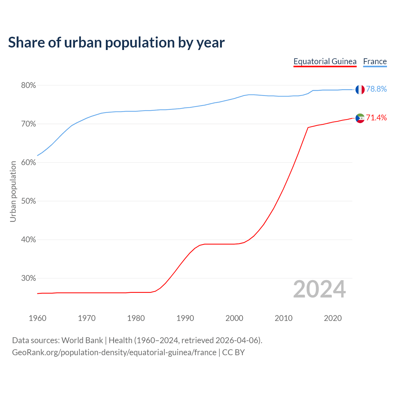 From 2004 to 2024, the share of urban population changed from 40.9% to 71.4% in Equatorial Guinea and from 77.5% to 78.8% in France.