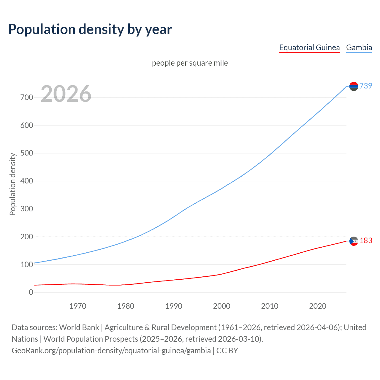 From 2006 to 2026, population density in Equatorial Guinea increased by 100.5%, compared to a 68.2% growth in the Gambia.